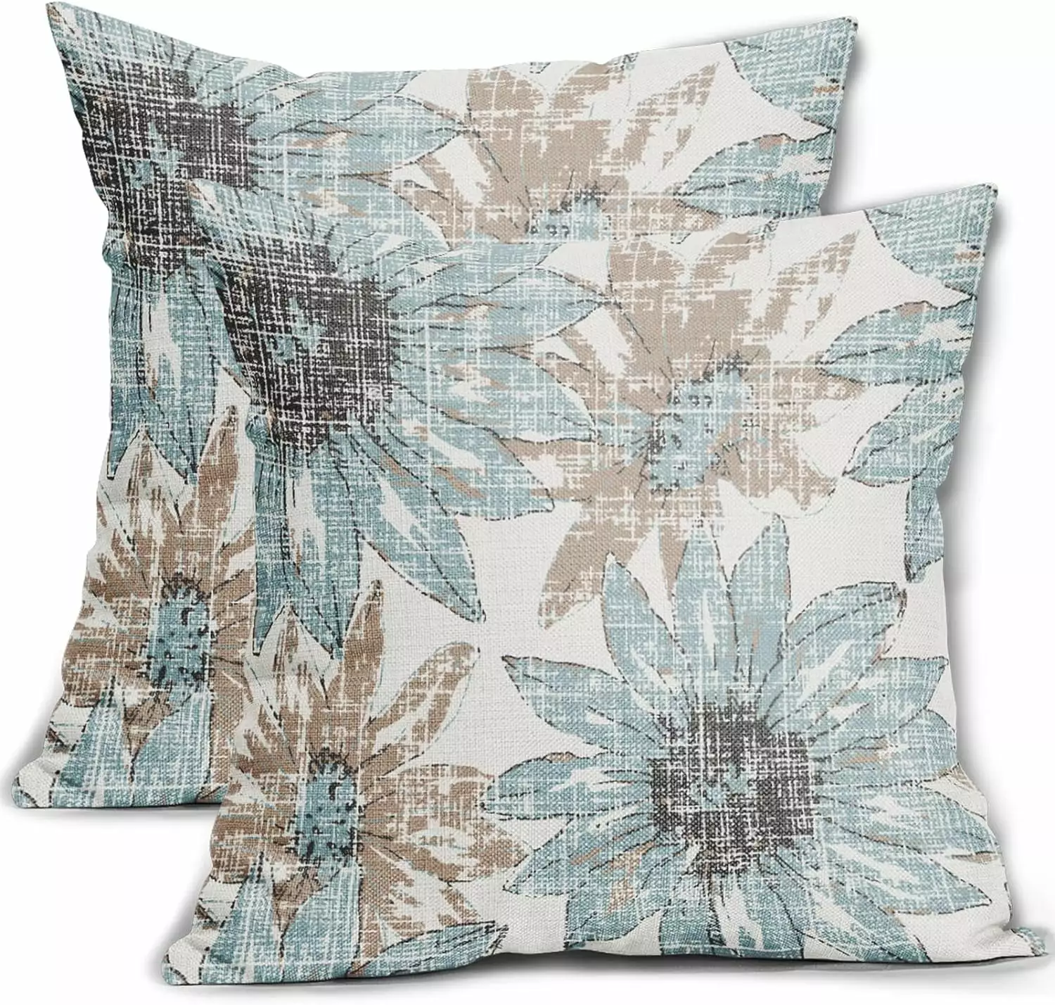 Light Blue and Brown Pillow Covers 18×18 Set of 2 Retro Sunflower Flowers Print Decorative Throw Pillows Outdoor Modern Art Floral Pillowcase Square Linen Cushion Case for Home Sofa Couch Bed