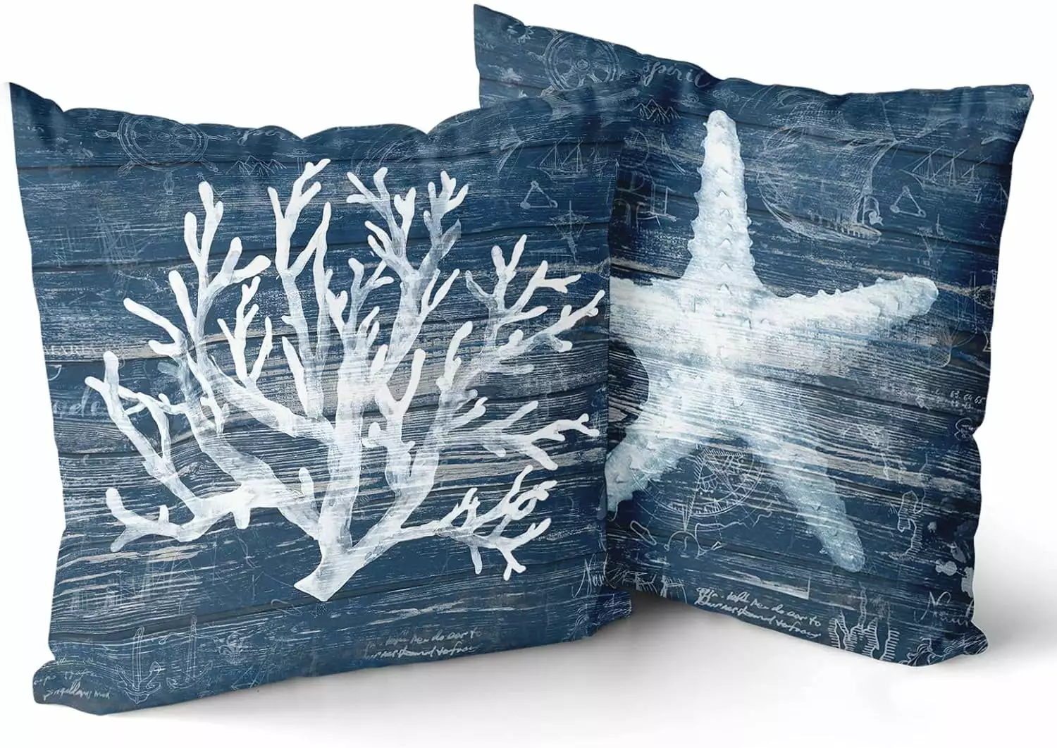 Nautical Coastal Throw Pillow Covers Set of 2 – Coral Starfish Wooden Themed Pillowcase 18×18 inch Blue Plank Home Decor for Sofa Bedroom Car Sea Plants Decorative Cushion Case
