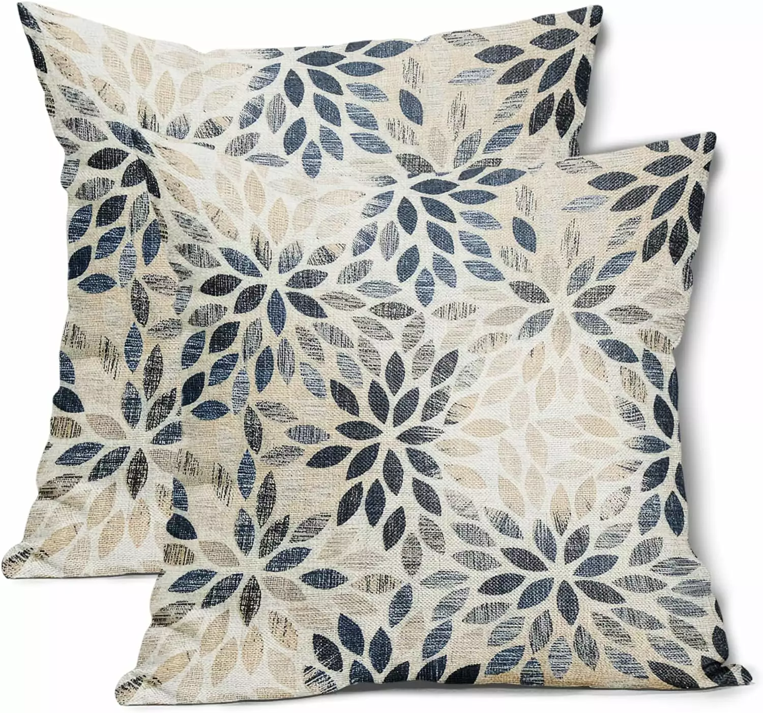 Navy Blue Dahlia Throw Pillow Covers 18×18 Inch Rustic Geometric Flower Decorative Square Pillow Cases Beige Tan Gray Floral Cushion Covers Farmhoutilize Home Decor For Sofa Bedroom Outdoor Set of 2