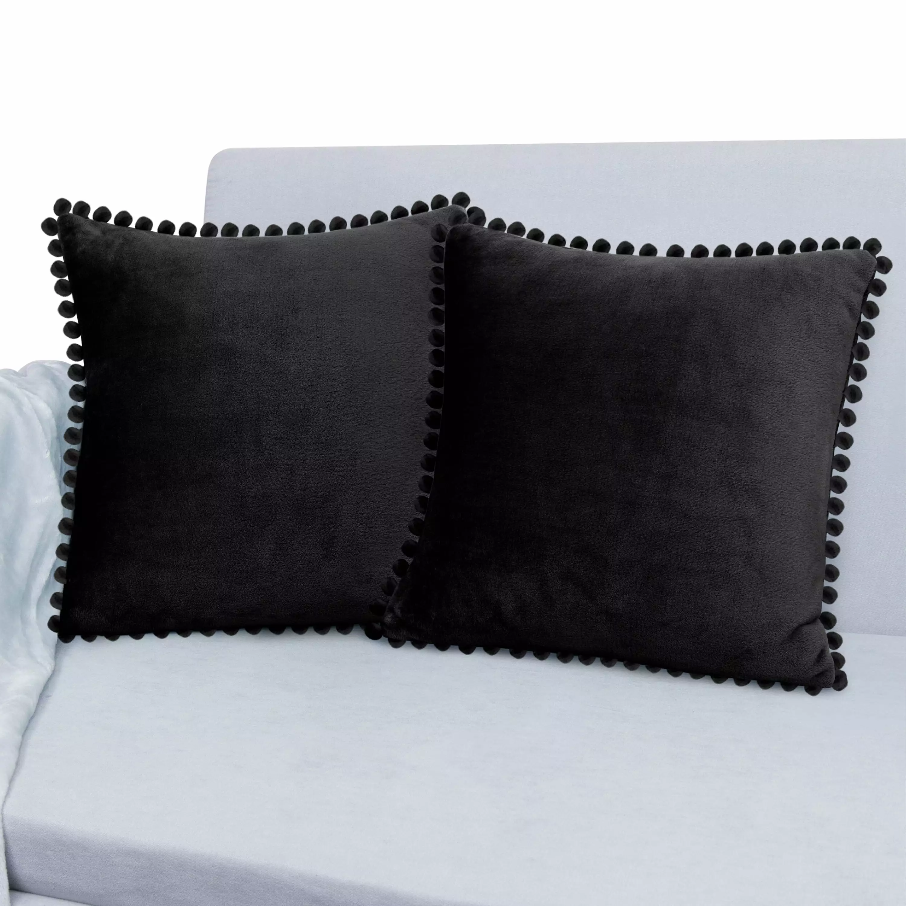 PAVILIA Black Throw Pillow Covers with Pom Pom 18×18 Set of 2. Decorative Pillow Cases Bed Sofa Couch. Boho Aesthetic Accent Decor Cushion Bedroom Living Room. Velvet Square Euro Sham Pompoms. Black