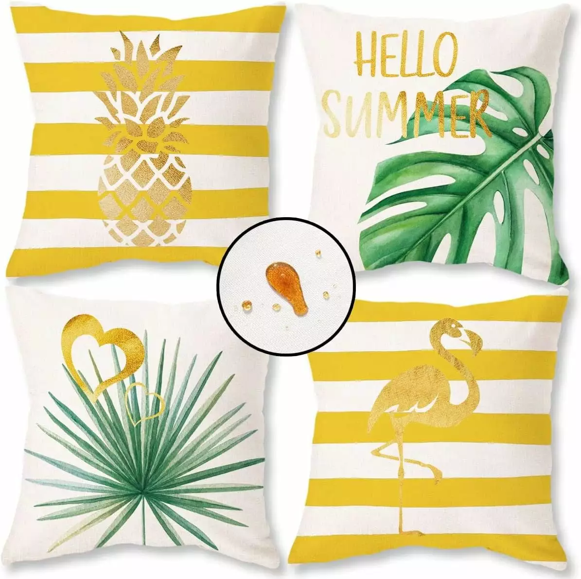YCHII Hello Summer Pillow Covers Waterproof 18×18 Set of 4 for Summer Decorations Black Stripe Gold Cushion Cases Tropical Pineapple Flamingo Throw Pillows for Couch Patio Furniture