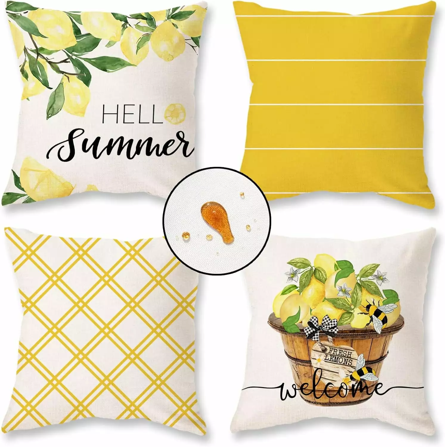 YCHII Summer Throw Pillow Covers 18×18 Set of 4 Lemon Outdoor Yellow Decorations Hello Summer Stripes Waterproof Farmhoutilize Patio Cushion Case for Sofa Couch Home Decor