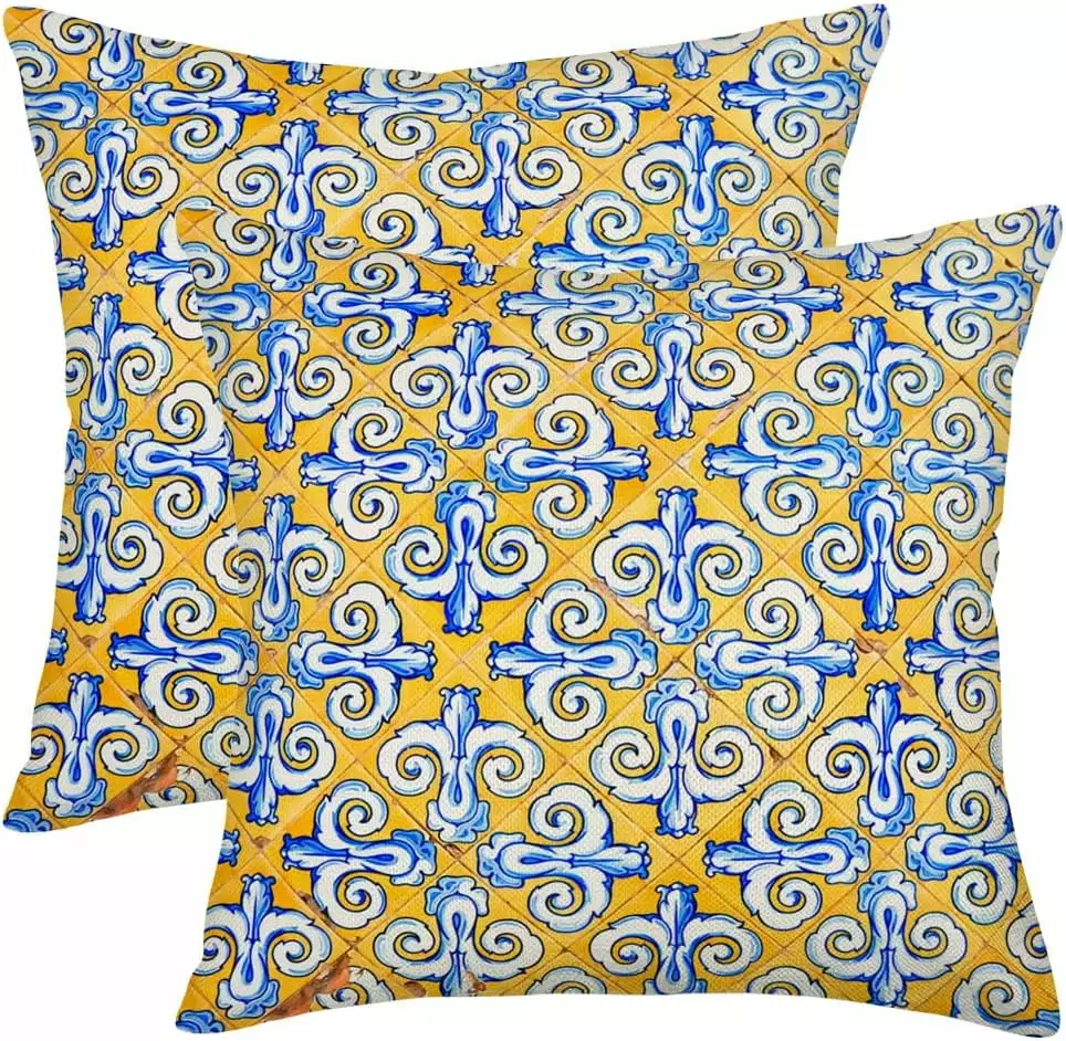 Yellow Boo Pillow Covers 18×18 Vintage Mexican Tiles Outdoor Farmhoutilize Cushion Cover Set of 2 Linen Square Throw Pillow Cases for Couch Sofa Car Living Room