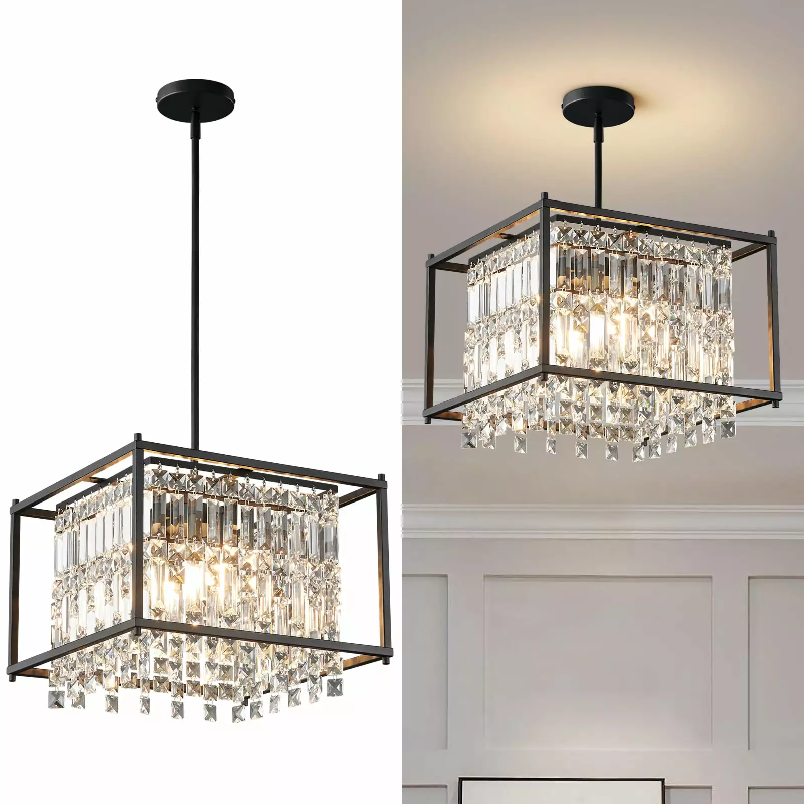 ZHLWIN 4-Light Black Metal Crystal Pendant Light. 15.74 inch Dining Room Light FixtureSquare Farmhoutilize Chandelier for Kitchen Island Dining Room Living Room