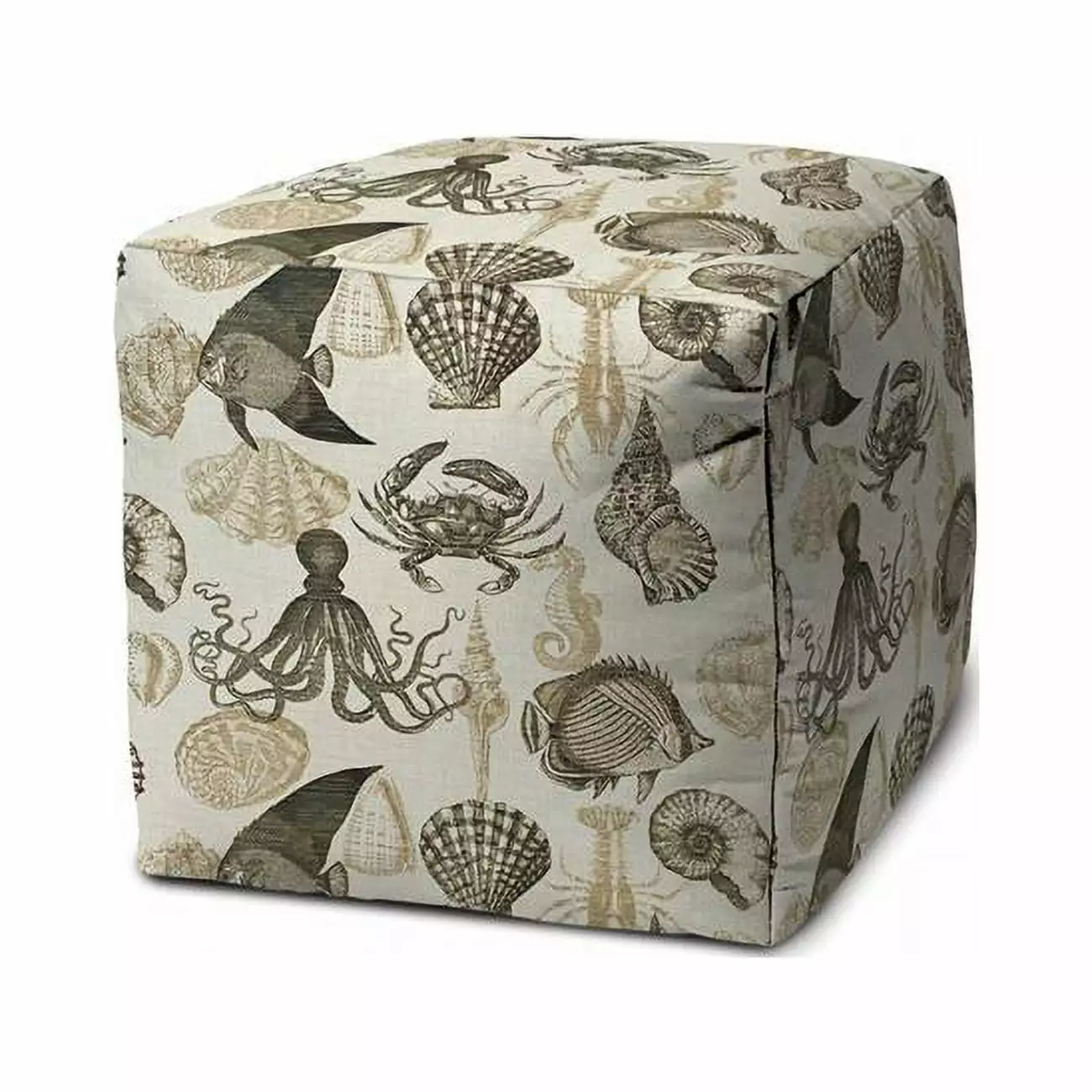 17 in. Polyester Cube Coastal Indoor & Outdoor Pouf Ottoman. Beige & Gray