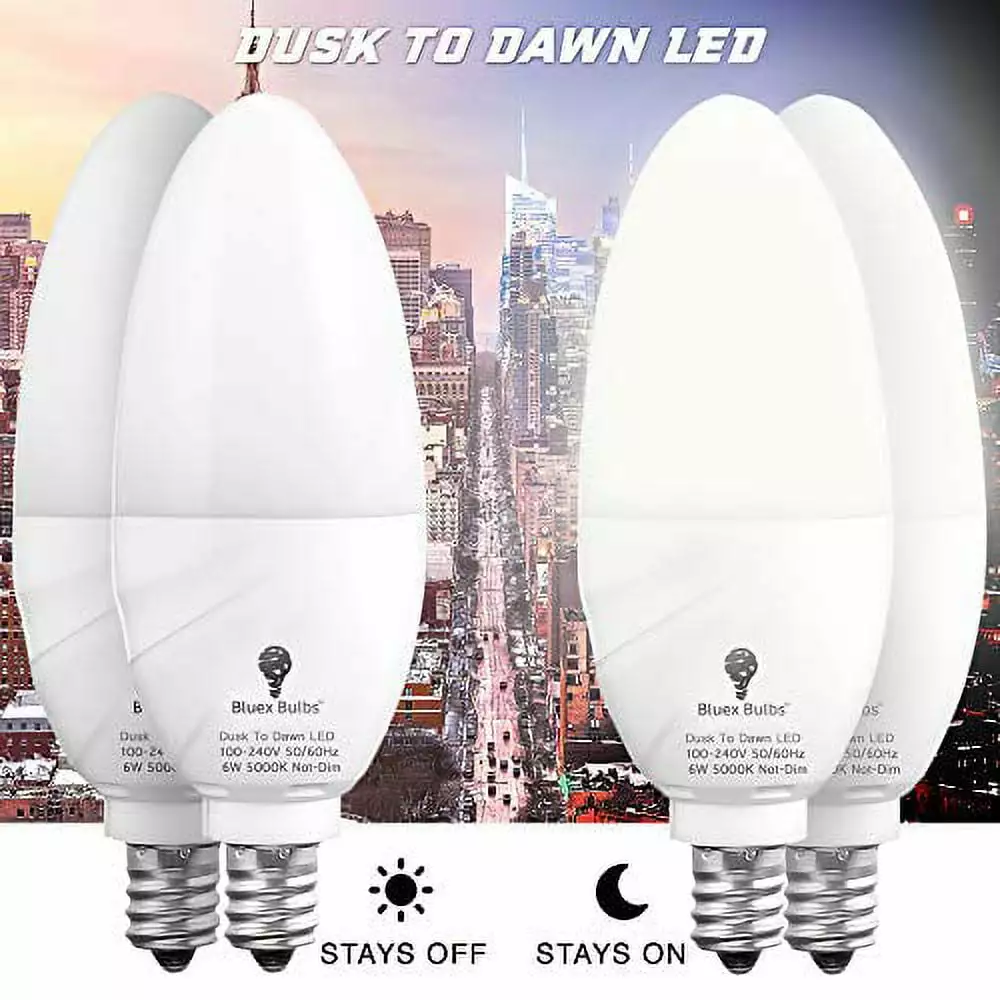 4 Pack BlueX Dusk to Dawn LED Bulbs. 6W E12 Base Light Bulb – 65W Equivalent ÿ 5000K Daylight White – Intelligent Light Sensor Candelabra Bulb. Home Security Indoor. Outdoor. Driveway. Yard. Porch Lighting