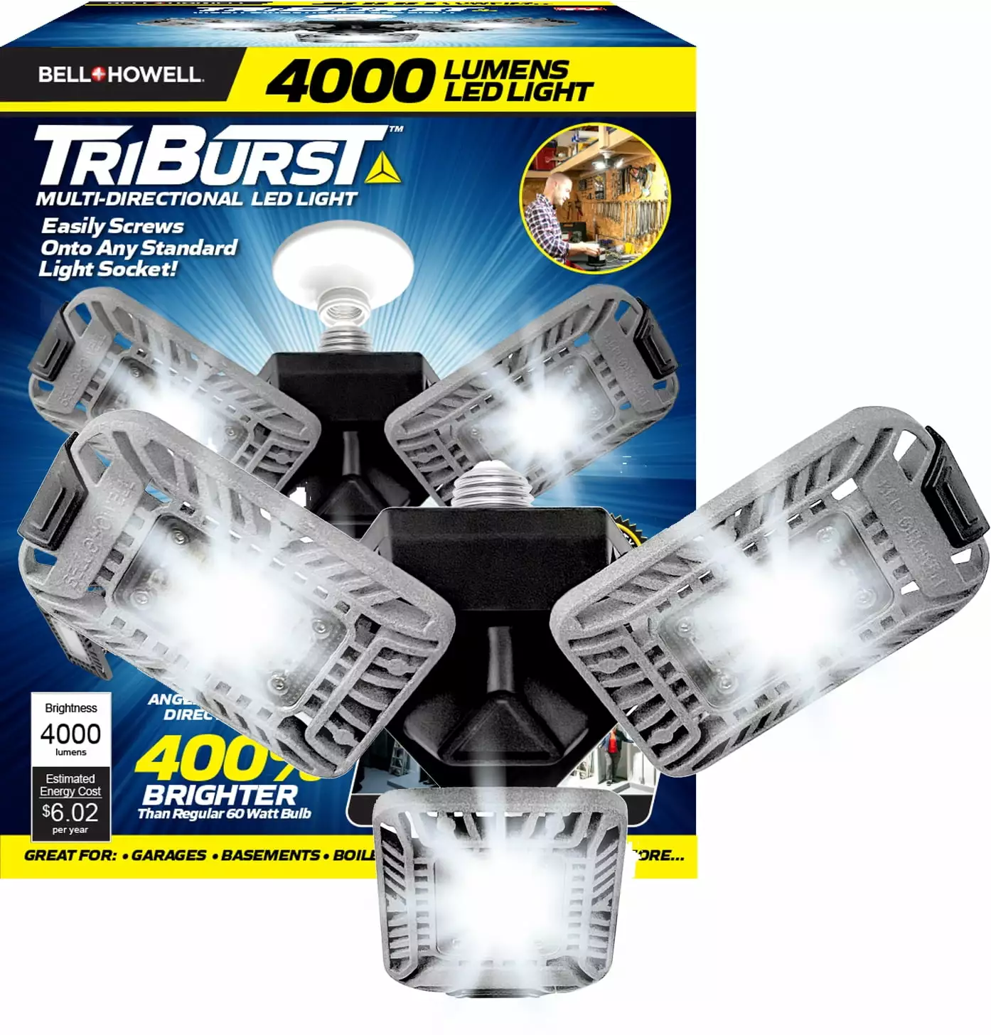 Bell and Howell TriBurst LED Garage Light Bulb 3 Panel Light 4000 Lumen 60W