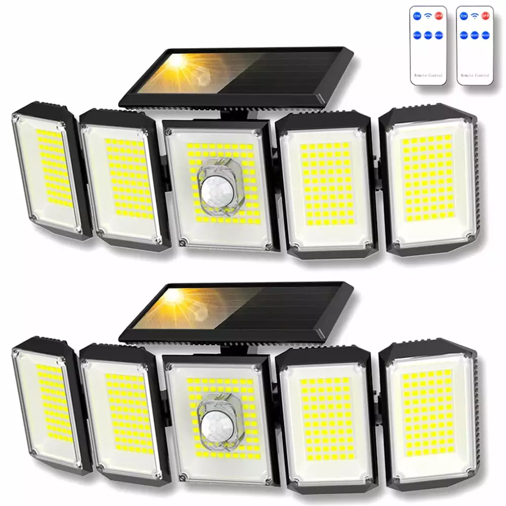 2 Pack Solar Lights Outdoor 300 LED 7000K Motion Sensor Lights. 5 Heads Waterproof Security Solar Flood Lights. 270 Wide Angle Illumination Wall Lights for Yard.Garage.Patio Entryways
