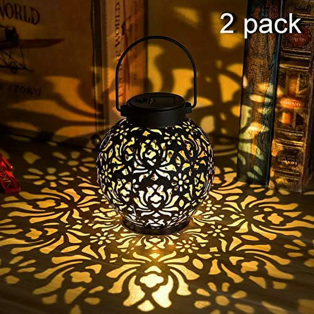 2 Pack Outdoor Solar Hanging Lantern Lights Metal LED Decorative Light for Garden Patio Courtyard Lawn and Tabletop with Hollowed-Out Design. Bronze Color.