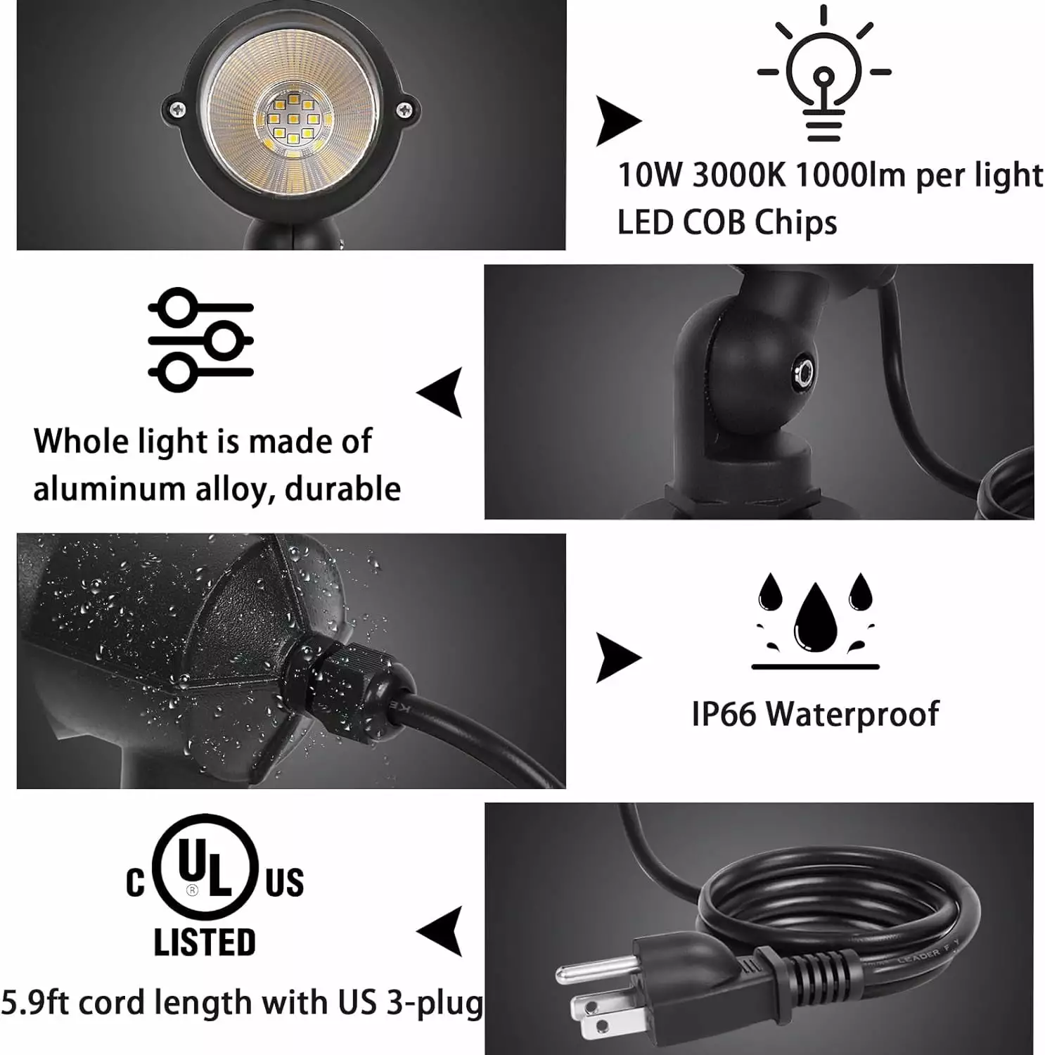 - ??Dusk to Dawn Outdoor Spotlight??Built-in the latest photoelectric sensor switch. 10W 3000K 1000lm bright spotlight will automatically turns on at dusk and off at dawn. Widely used in landscape lighting. Great for illuminating your Flag Poles. Palm trees. House. Garden. Patio. Back Yard. Fences.