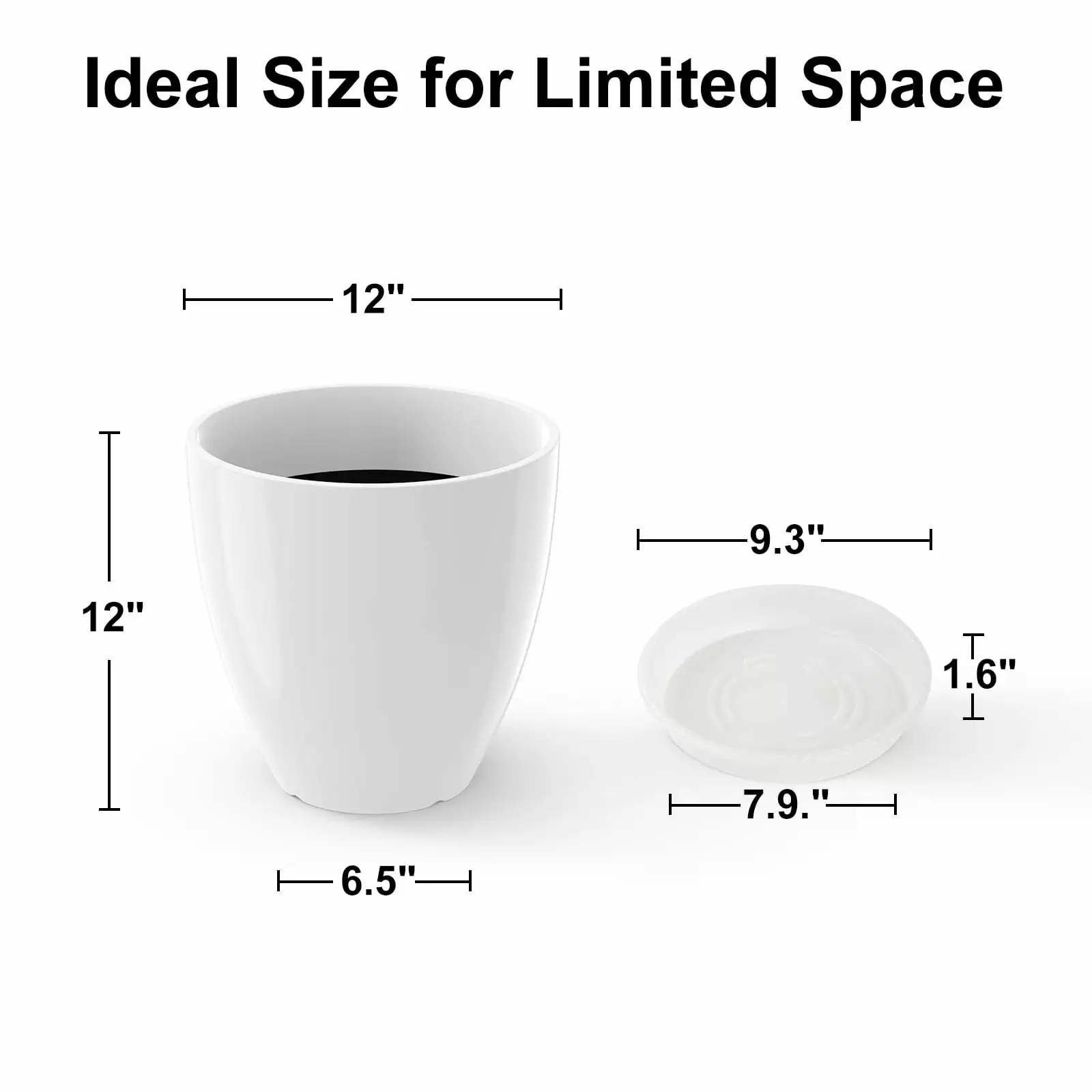 12 Round Planter Modern Resin Vase. Indoor/Outdoor with Drainage Holes. Flower Pot for Balcony. Garden Patio Deck – White