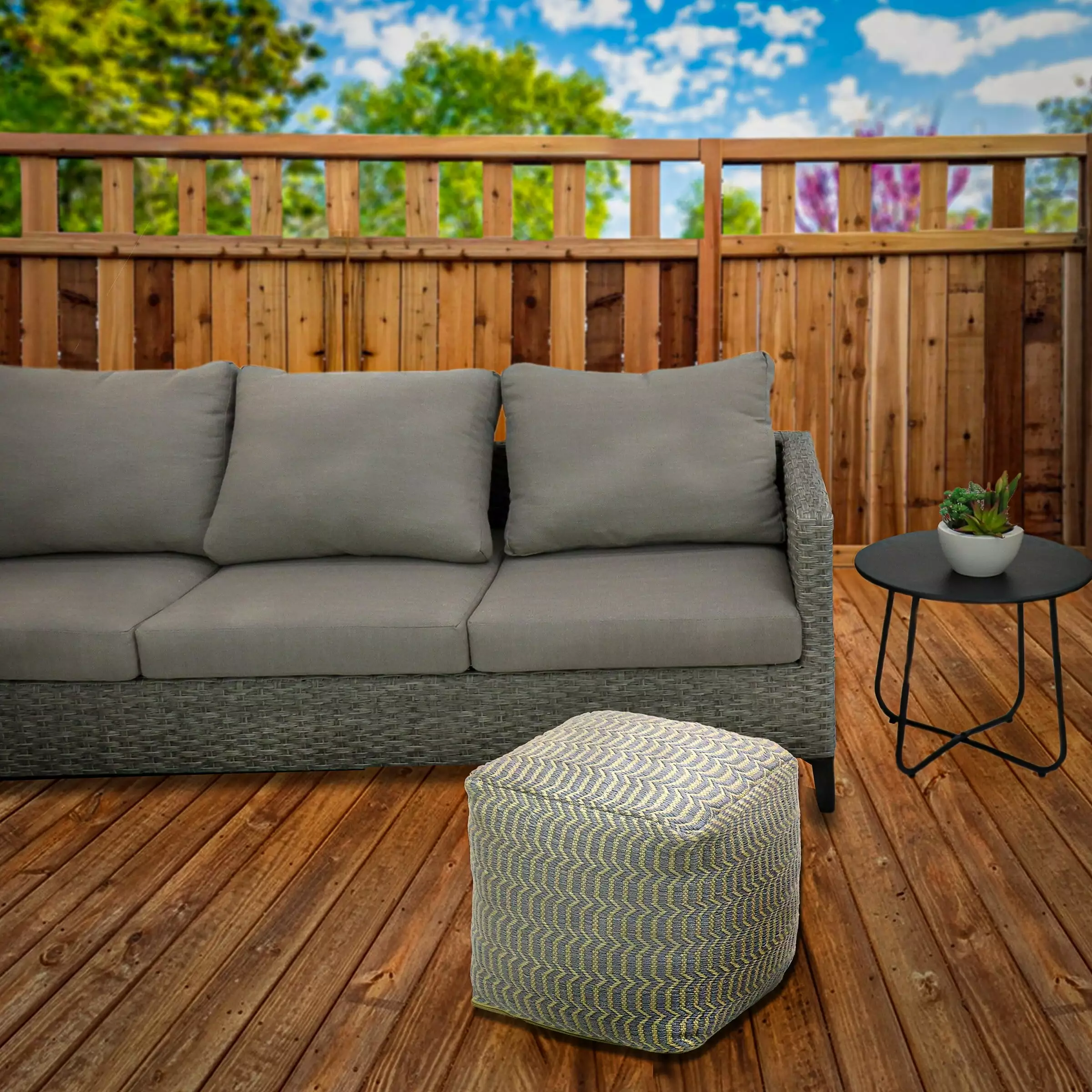 This 16 Hand Woven Pouf Ottoman adds style and versatility to any space. It’s hand-woven from a strong. sustainable polyester cover that’s designed to endure outdoor environments and filled with soft. supportive polystyrene Bean Fill. It’s perfect for use as an extra seat. footrest. or tabletop. and its repeating pattern in gray is sure to make a statement wherever it’s placed.
