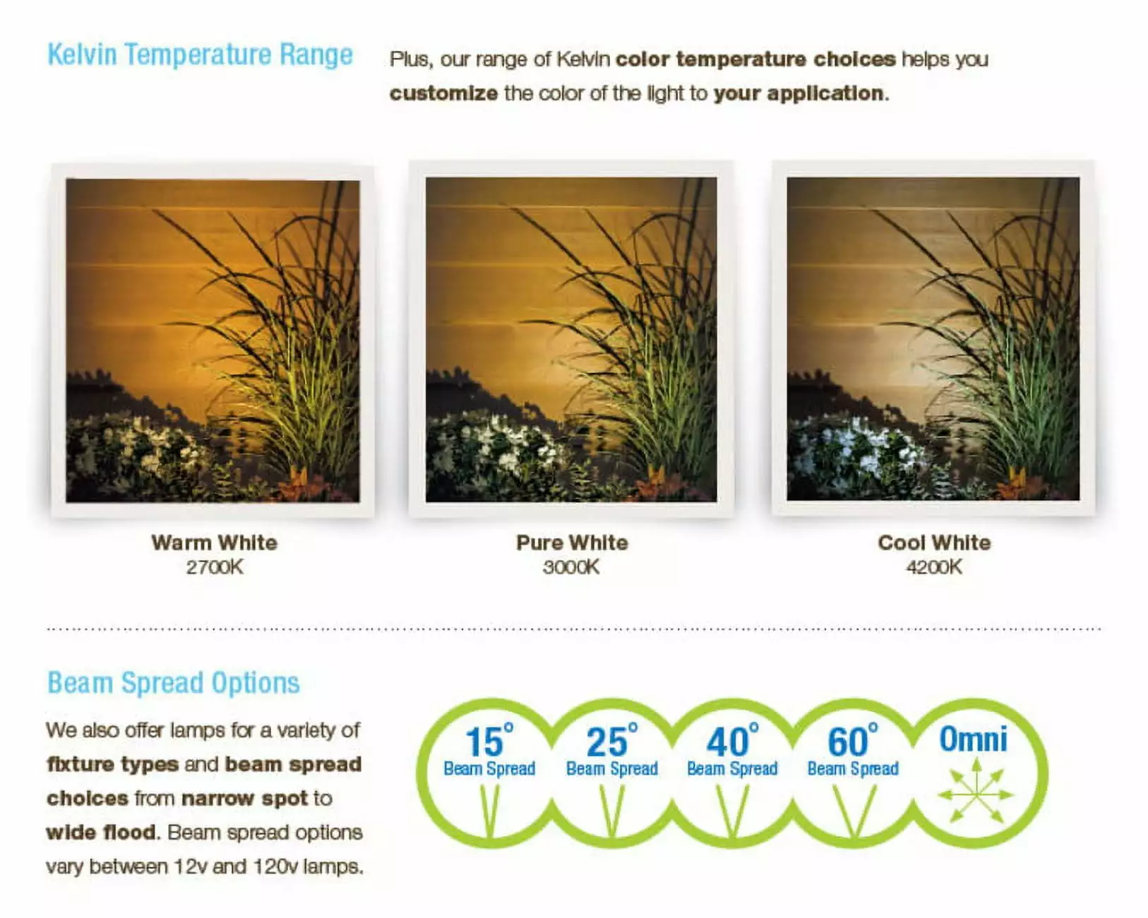 Material: Aluminum. Finish Color: Clear. Lamping Type: LED. Wattage: 4 Watts. Cri: 80. Color Temperature: 3000 Kelvin. Lumens: 285. Dimmable: No. Moisture Rating: Damp Rated. Desc: This Damp Location Mr16 Bi-Pin 12V Led Lamp Compares To The 20-25W Halogen. Featuring A 3000K Pure White Temperature. This Lamp Puts Forth A 60-Degree Wide Flood Beam Spread Angle.. – – Accessory – 2 Inch 4W 3000K Mr16 Led 60 Degree Replacement Bulb –