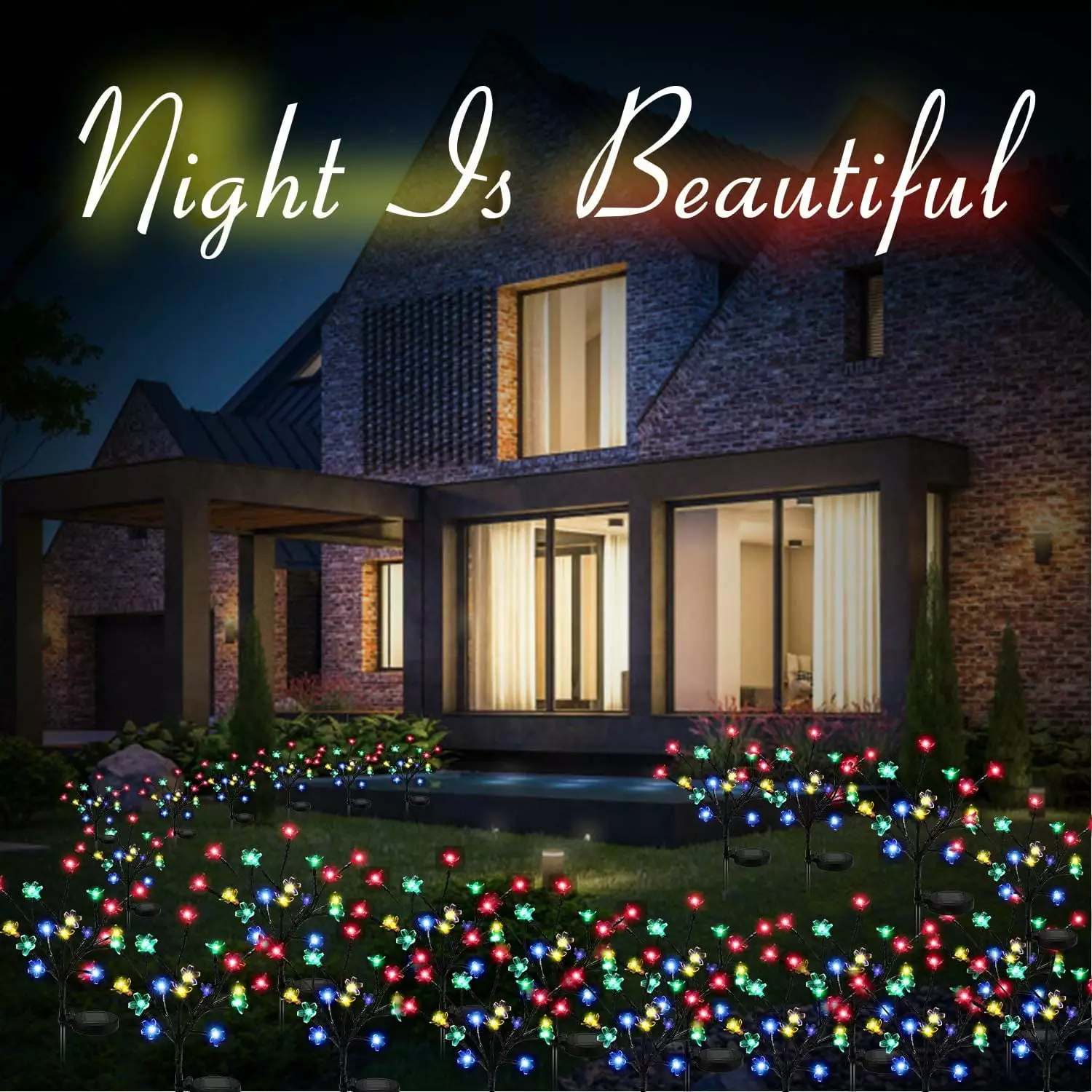 Beautiful Bright Solar Garden Lights Solar decorative Lights with Super pretty 20 LEDs Cherry Blossom glow a multicolored light to your yard. with flash and steady on lighting modes. The colored solar fairy lights provide soft lighting and make a wonderful addition to any yard or patio. A good choice in party or holiday seasons.New Upgraded Solar Panel & Adjustable Stems Upgraded wider solar panel converts sunlight into power 17% faster and more efficient in cloudy weather. energy-efficient built-in battery to maximize lighting time. You can bend the solar flowers stems into different angel and style. IP65 Waterproof design ensures the outdoor solar lights withstand all bad weather. No worries about sunny. rainy and small snowy days. Auto on/off Flower Lights It can be turned on automatically at night or in the dark environment. and it turns off auto in the daytime or in bright places. 8-10 Hours super long working time after 4-6hours full charge (The time will change depending on the weather). Beautiful. bright and long lasting. You never have to worry about the electricity bill as it uses free solar energy. Easy to Install No batteries and wires required. The Solar landscape lights can be installed in ONE minutes. Just push the switch to ON position at the first use. directly stick into the ground. adjust the the solar panel to make sure the solar lights can receive maximum sunlight. You can move the lights to a different location if desired. keeping your garden decorations fresh and varied. Perfect Garden Decoration & Gifts Maybe your flower bed or lawn is beautiful. but these yard lights will plus a special flair for your home. Ideal for your walkway. patio. garden. lawn. front yard. backyard. Flower beds. It’s also a perfect decoration lights for Christmas. Thanksgiving Day etc. Beautiful Colored Solar Lights Outdoor Specifications1. Solar panel: 2V 80mA Upgraded Polycrystalline solar panels2. Light source: 20 super beautiful bright LEDs3. Ni-Mh batteries: 600 mAh.1.2V/1Pc4. Charging time: 4-6h working time:8-10h5. Product overall height: 65cm / 26 inch6. Switch: Light control. OFF/ON Two modes7. Material: Stainless steel + PP + ABS8. Package Included: 2 * solar Flower Lights (Multi-color)IP65 waterproof Rate: easy to work no matter in sunny days.rainy days or small snowy days.Your Money Saving & Energy SavingSolar charged flower lights convert sunlight into energy. no electricity needed. helps to cut your utility bill.Upgraded solar panel is now convert sunlight into energy 17% faster and more efficient when compare to older version solar panel.Two Working Modes DesignWorking modes: STEADY ON / FLASH ( Pressed to the far right on button will steady on. A little bit in the middle is a flashing mode)