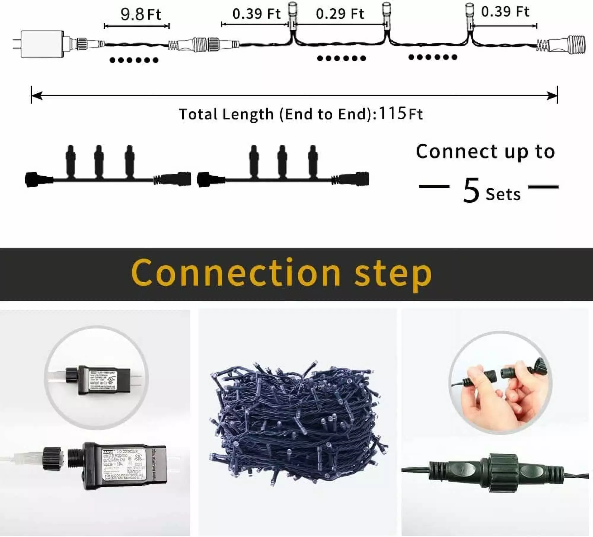 End To End Expandable String Lights — Female plug at the end is connectable for more than one string. which makes you can connect max 5 sets together. Each one length is 35m/115ft. the max expandable length is 175m/575 ft. Flexible usage in different scences.