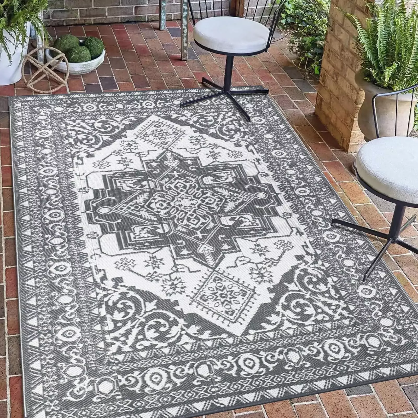 - 4×6 Waterproof. Reversible Plastic Straw Outdoor Rugs for Patios | Also for Camping. RV. Deck. Porch. Balcony. Camp. Patio | Gray. Floral | Size: 3’9” x 5’11”