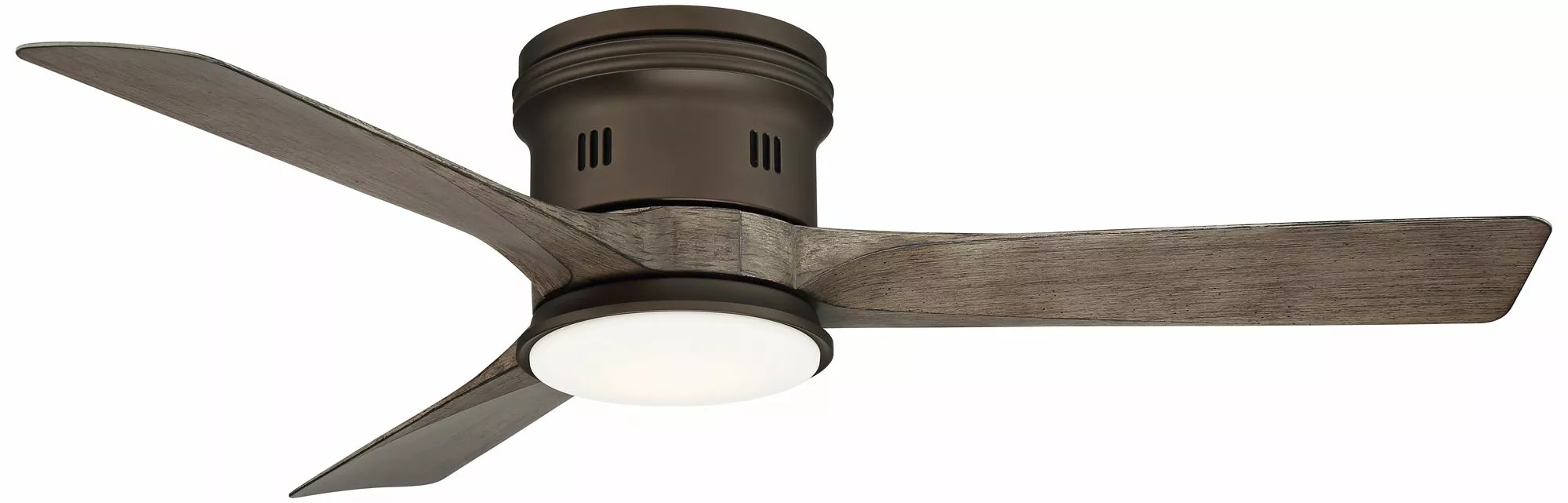 Offering a handsome modern farmhouse look. this indoor-outdoor LED ceiling fan is rated for use in damp locations. It comes in a hugger design for installing flush onto a ceiling. with a bronze finish motor and three molded ABS blades in a seasoned wood finish. An energy-efficient LED module is built into the bottom and covered in opal glass.