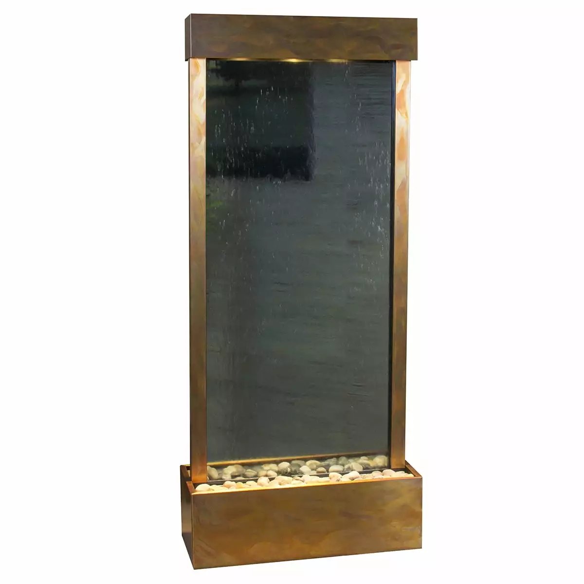 Adagio Harmony River Fountain – Center Mount – Rustic Copper – Choose OptionsA comforting and tranquil environment is the natural result of combining soft halogen lighting over the gentle movement and sound of water in motion. These stunning water features are handcrafted and custom-. The Harmony River Collection features a single face available in clear or blue glass. The Hood and Tray are available in Antique Bronze. Blackened Copper. Rustic Copper. or Stainless Steel in a flush or center mount. The heavy duty tray liners are double tested to ensure a water tight seal. The adjustable splash guard (pebble beach tray) prevents splashing. hides the pump from view. and displays our pebble beach made up of natural polished river rock. Create a stunning impact with this single faced free-standing feature in your home. office. entry. or boardroom.