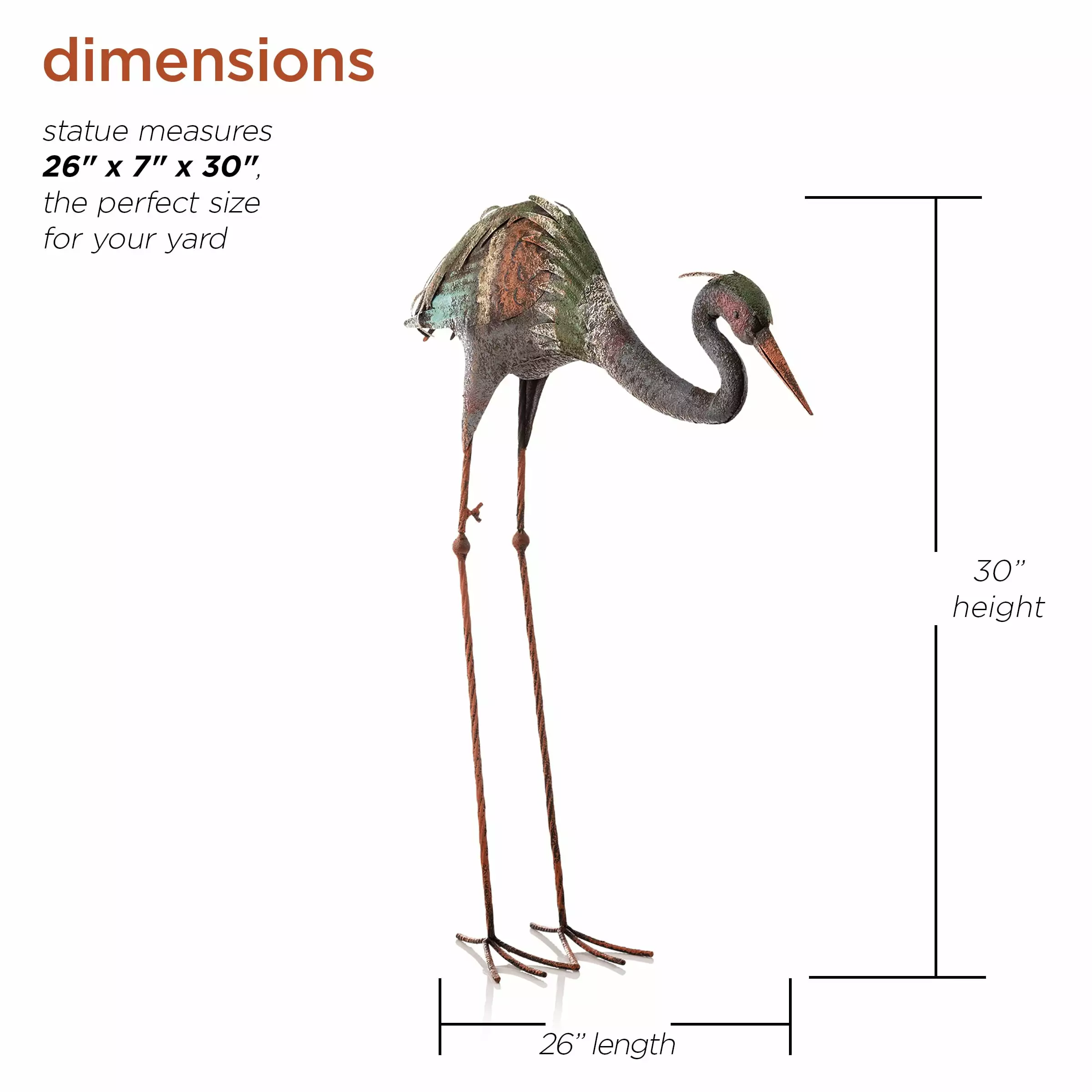Enhance your indoor or outdoor living space with the Alpine Corporation Metal Crane Garden Statue. Elegant and decorative. this stylish bowing crane statue featuring beautifully blended colorful feathers adds a peaceful yet classic look to any outdoor setting such as gardens. entryways. patios. backyards. pathways. decks. and more. It can also be used in your flowerbeds. as a table centerpiece. or as part of your home’s interior decor. and you can add one or multiple crane statues to create an beautiful display. Constructed from durable metal. this gorgeous crane statue is rust and weather-resistant to offer years of quality use. The statue measures 26" x 7" x 30" for the perfect fit inside or outside your home.