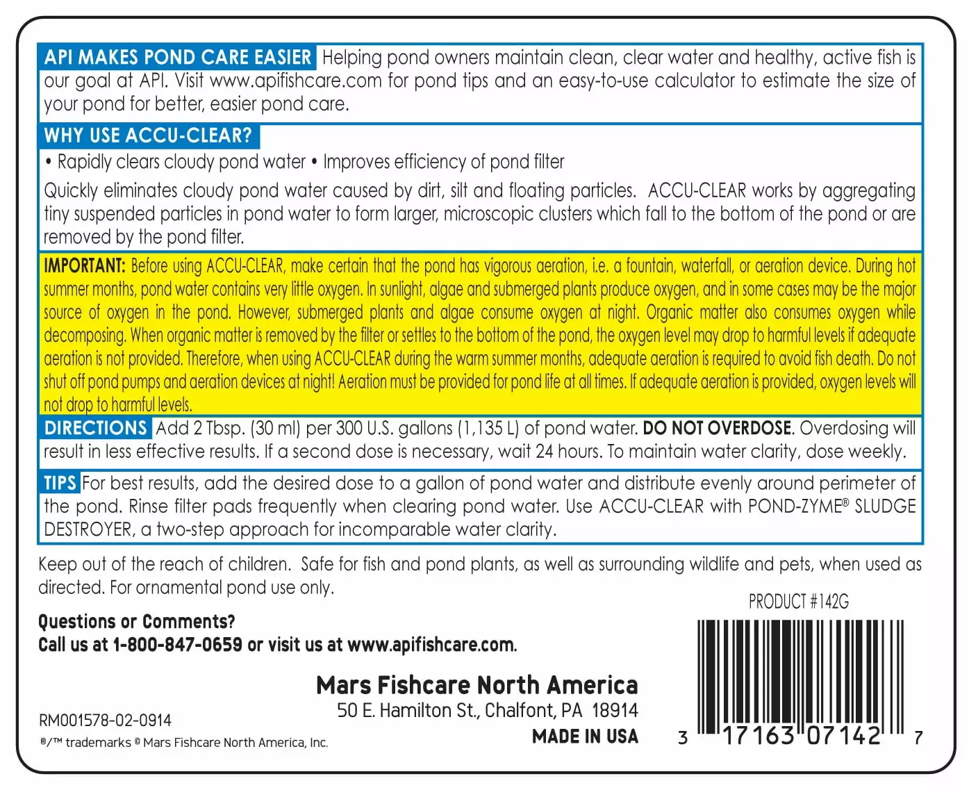 API POND ACCU-CLEAR Pond Water Clarifier quickly eliminates cloudy pond water caused by dirt. silt and floating particles. This fast-working pond works by aggregating tiny suspended particles in pond water to form larger clusters which fall to the bottom of the pond or are removed by the pond filter. API POND ACCU-CLEAR rapidly clears cloudy pond water and improves the efficiency of the pond filter. Exclusively for freshwater ponds. this solution can be used weekly or whenever cloudy water is observed. Be sure to use as directed for best results. With API POND products. it’s easy to keep a beautiful pond. For over 50 years. API has been creating innovative. research-driven solutions that make it easier to care for your pond. API POND Pond Treatment Supplies are designed to work in conjunction with each other to provide best results to control algae. promote healthy bacterial growth and help control and fish diseases and conditions such as ich and fin rot. They work to provide a safe. hospitable environment for fish such as koi. catfish. perch. goldfish and more. With API. you can spend more time admiring your fish. and less time scrubbing your pond. Make sure to use all products as directed in order to ensure the best results.Contains one (1) API POND ACCU-CLEAR Pond Water Clarifier 32-Ounce Bottle.Helps clear cloudy pond water of dirt. silt and floating particles.Clumps floating particles into large clusters that can be easily removed by a pond filter.Works quickly and improves the overall efficiency of your pond filter.Use weekly or when cloudy water is observed in freshwater ponds