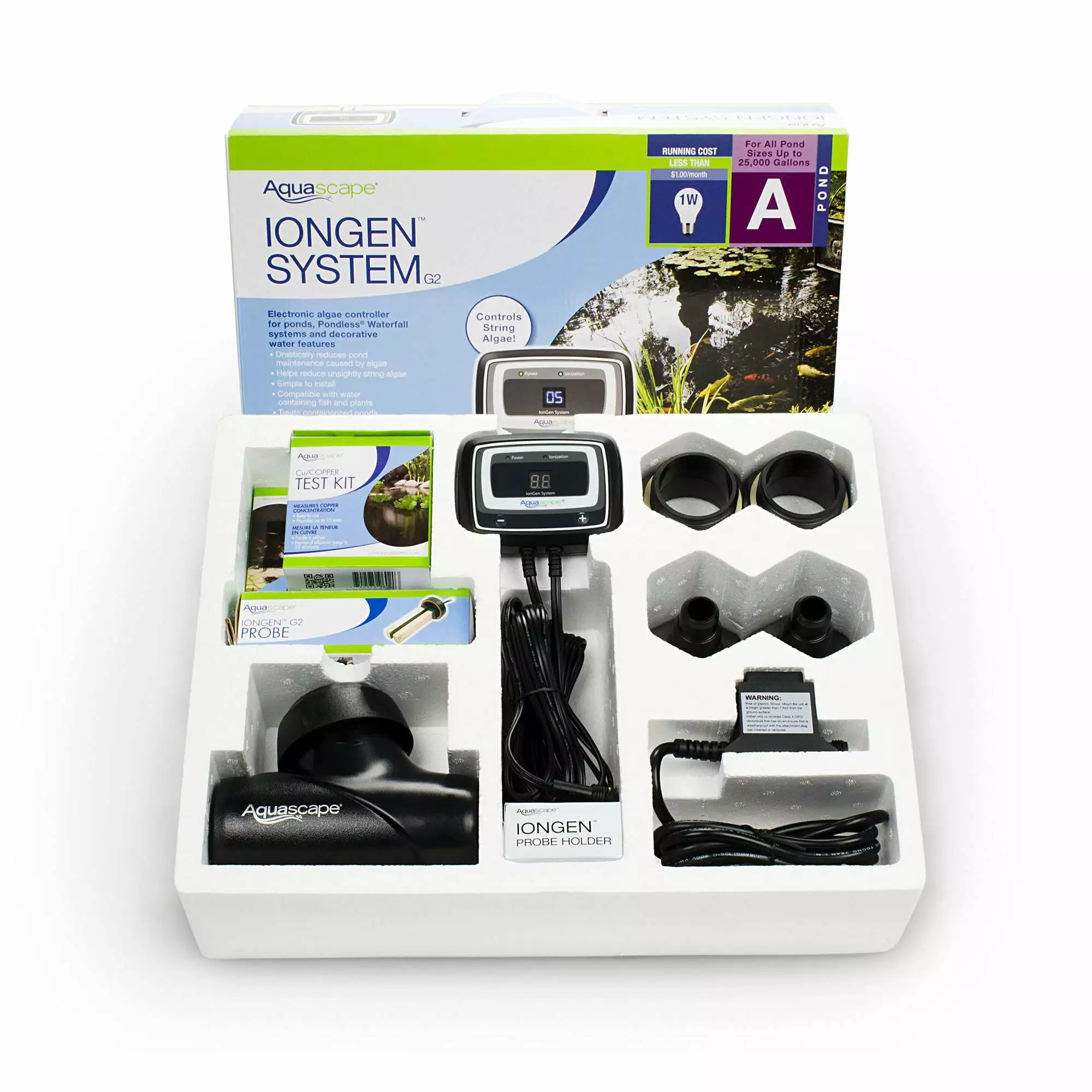 Say so long to that unsightly algae taking over your backyard water feature without the need for manual cleaning or dangerous chemicals thanks to the Aquascape IonGen G2 Chemical Free Pond Algae Control System. The IonGen system uses a microprocessor and ion producing probe to naturally kill noxious algae in your pond without traditional liquid chemicals. Likewise. this natural pond algae control system is safe for your fish and plants. Able to control algae in your entire system (up to 25.000 gallons) with an energy efficient design that uses less than $1 of electricity per month. this water feature algae control solution includes an electronic control panel. transformer. flow chamber. probe. and multiple fittings. Install easily without tools and make pond maintenance 1 less headache you have to worry about with this serious yet natural pond algae killer.