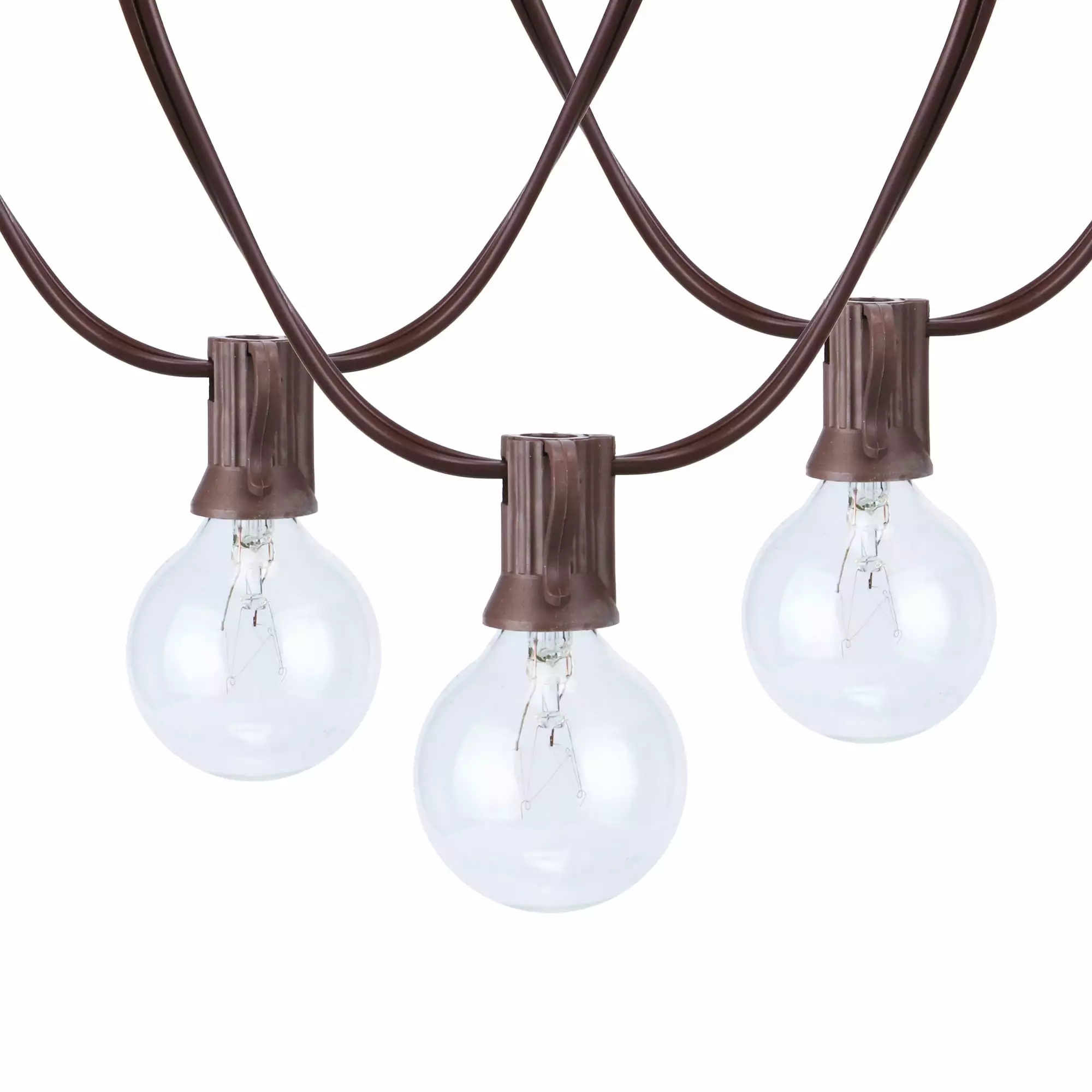 Better Homes & Gardens 18.7 feet 20 Count G40 Clear Glass Globe Bulbs Brown Wire String Lights for Outdoor and Indoor Use Illuminate a backyard with Better Homes & Gardens 20 Count G40 Clear Glass Globe Bulbs Brown Wire String Lights. With Clear G40 Glass Globe Bulbs. they produce a soft warm white light that helps enhance most decor. Set them up on a patio or in a garden for relaxing at night. Thanks to a versatile construction. These outdoor decor string lights also works inside the home. The string measures 20ft (6.1m) in total length. 18.7ft (5.7m) in lighted length and has 20 count G40 glass incandescent bulbs with 2 spare bulbs attached. it can connect up to 3 sets for a lighted length 58.7ft (17.9m). There are small hanger on each lamp holder. very easy to hanging anywhere of your house. This string light is UL listed to help ensure safety during use.
