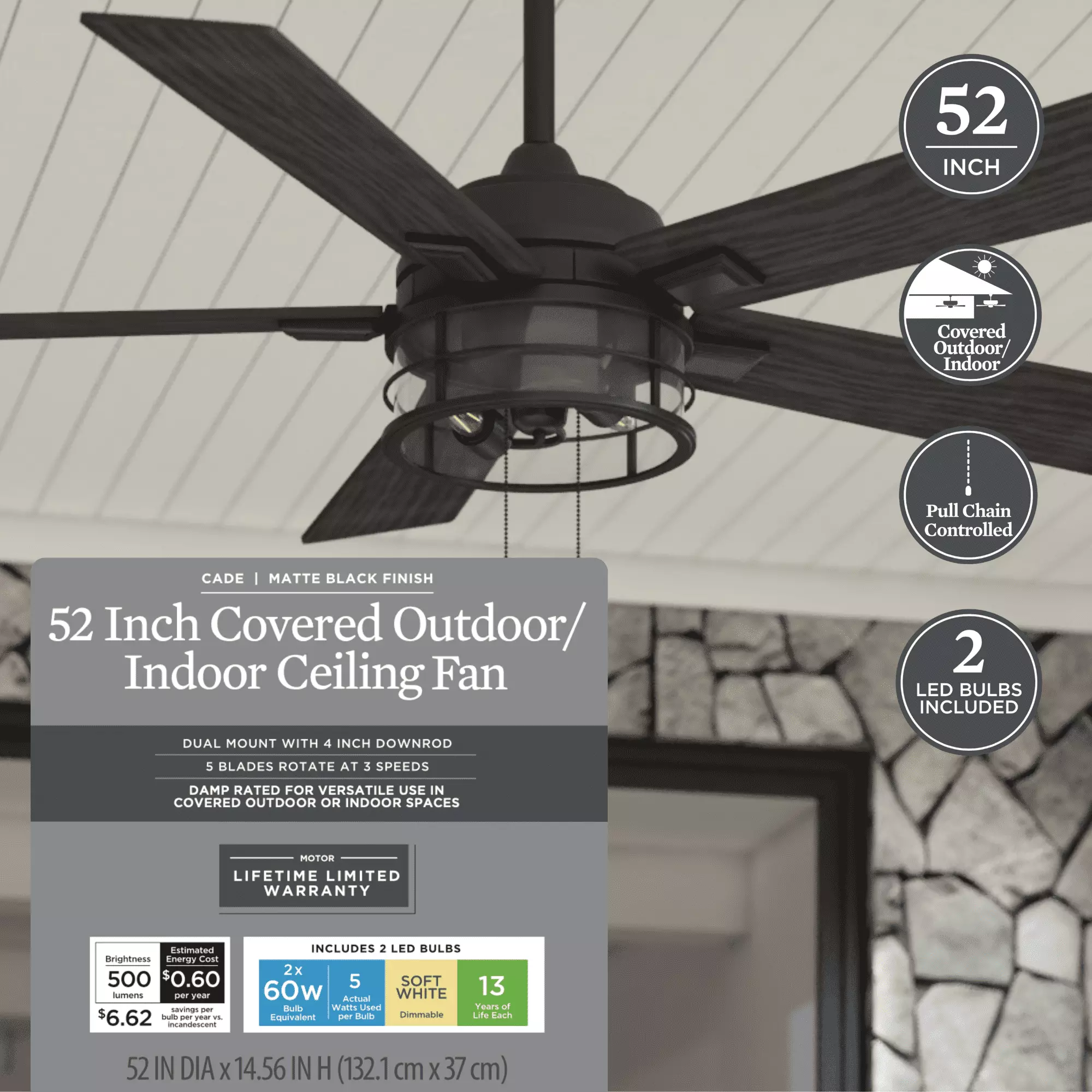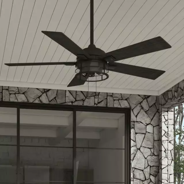 This indoor/outdoor ceiling fan features an integrated clear glass globe with cage that houses two E26. B10 LED bulbs. illuminating your space. The 5-blade design provides comforting. adjustable airflow. Use the reversible airflow switch to properly distribute air during warmer and colder months. This ceiling fan was created with high-quality materials that are durable and long-lasting and comes with a 5 year warranty from the manufacturer.