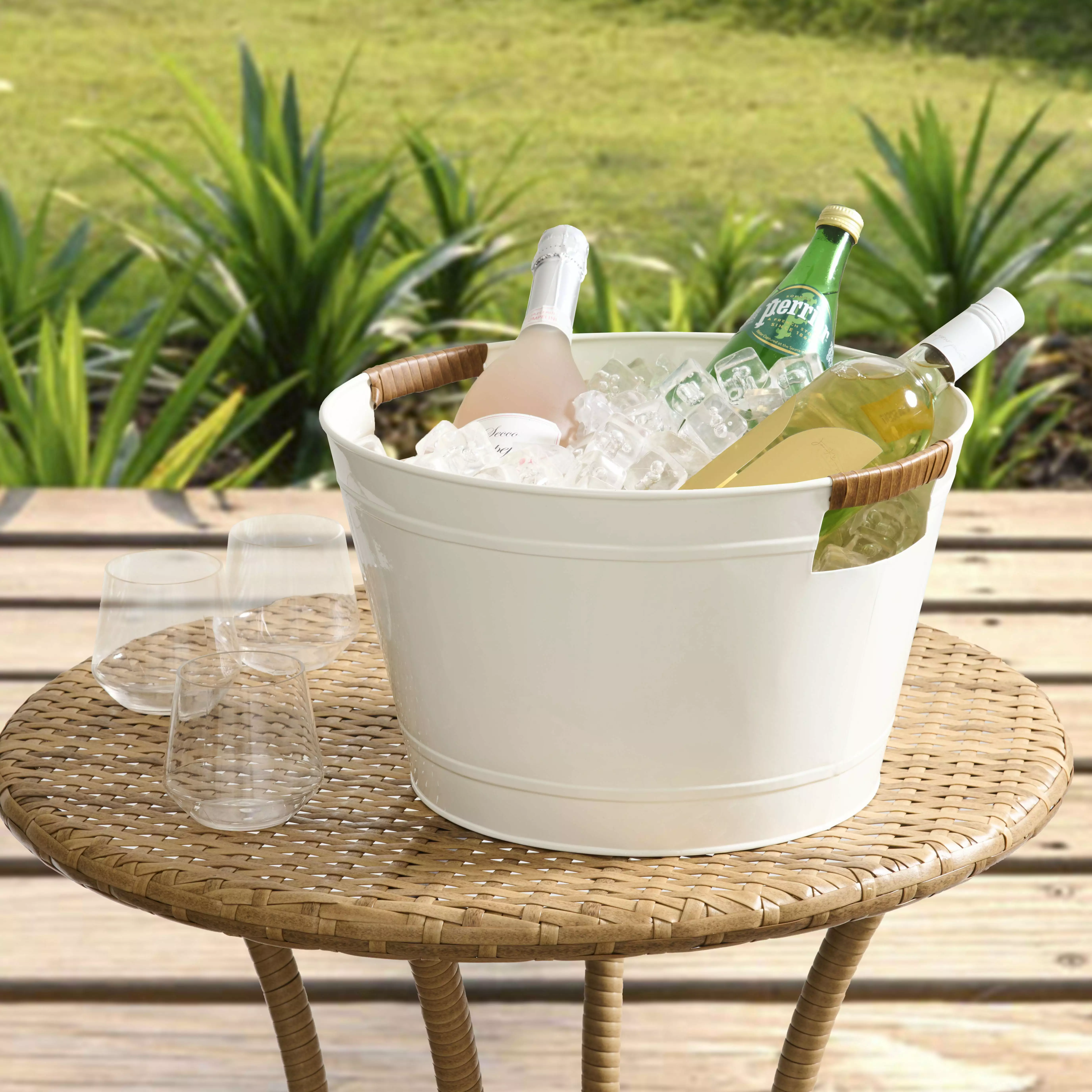 Update and upgrade your party Decor with the Better Homes & Gardens Round Iron Tub. Vanilla. Fashion meets function with this stylish. round 15D x 9H tub you can use for storage. creating decorative arrangements. or as a party tub to hold snacks. ice. or beverages. The vanilla finish and minimalist detail on this all-occasion. iron tub present a simple. classic style that complements most Decor. The durable rattan handles add just enough contrast and helpful nonslip grips. This lovely. round tub will serve all your indoor and outdoor functions beautifully for years to come.