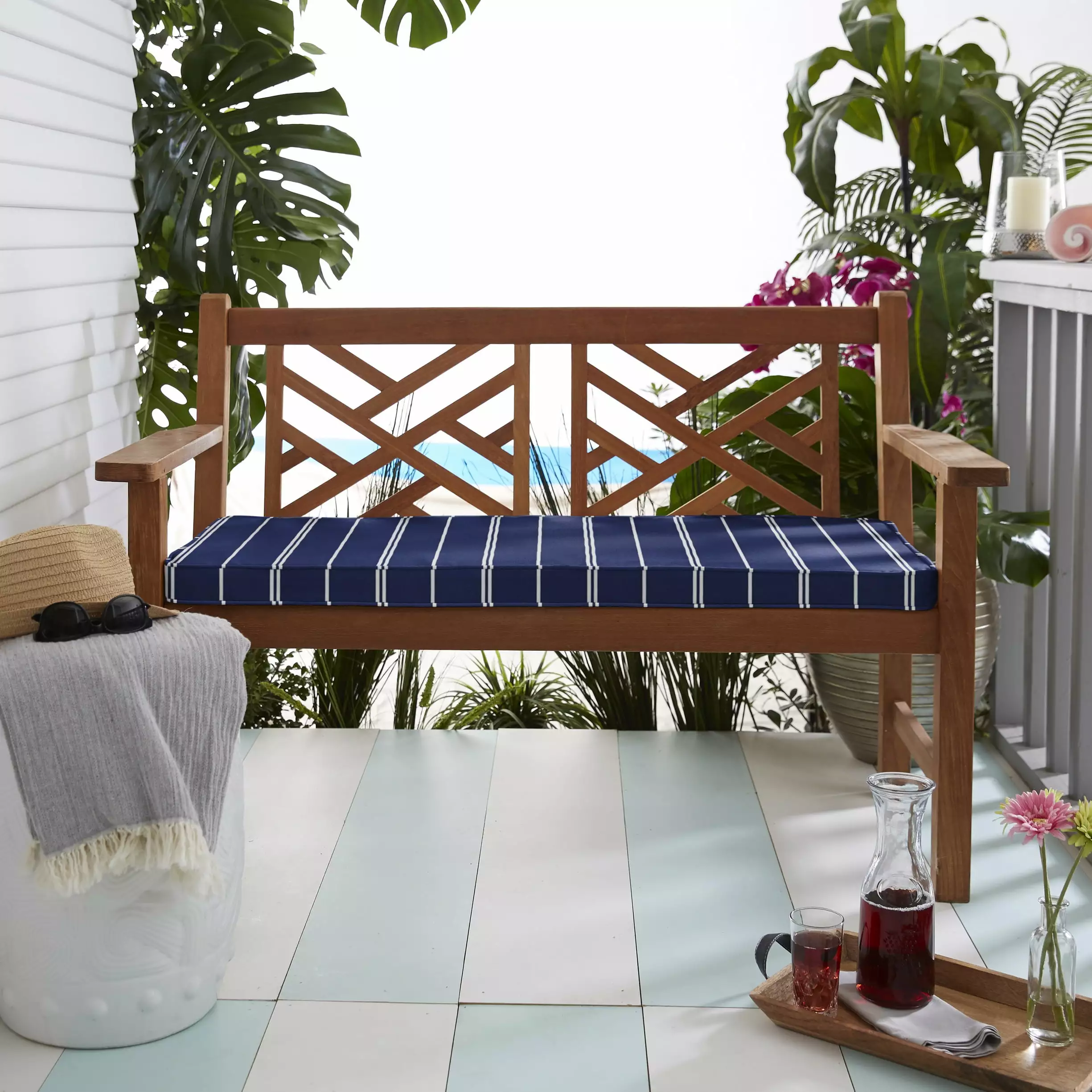 A classic nautical palette of navy and white brings classic. timeless appeal to this indoor-outdoor bench cushion. Designed with Richloom Pursuit Navy fabric with a navy blue base and thin white stripes. the cushion is perfect for a reinvention of any bench in the backyard or a sunroom. Matching corded trim completes the look with sophistication and tailored flair.