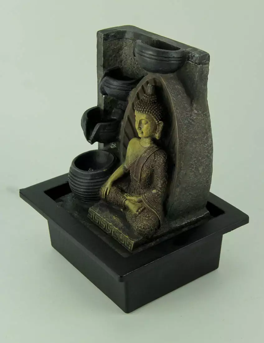Give your indoor decor an instant style boost that creates a relaxing atmosphere sure to soften even the hardest day with this Buddha water fountain. It features Buddha sitting in meditation with his right hand touchig the earth as water flows down each scoop in a cascading stream around him. It is made of durable plastic and includes a submersible pump and power cord. This 10.25 inch high. 8 inch long. 7 inch wide fountain is a great piece that will enhance the look of your home interior and makes a decorative statement for its look alone.