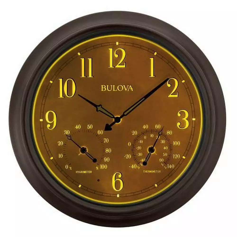 Beautiful enough to hang in your living room but tough enough for the outdoors. the Bulova Revere Wall Clock makes it easy to keep on top of time and temperature even when you’re outside. This beautiful clock has a two-step metal case in an oil-rubbed bronze finish. The movement is sealed with a gasket for protection from outdoor elements. The light-reflective ink of the numerals is easy to see. especially when illuminated by the four strategically placed LED lights. The lights are controlled by a light sensor. which activates at dusk and turns off at dawn. This beautiful clock also includes a thermometer with Fahrenheit and Celsius scales and a hygrometer. both of which are also easy to read at night.