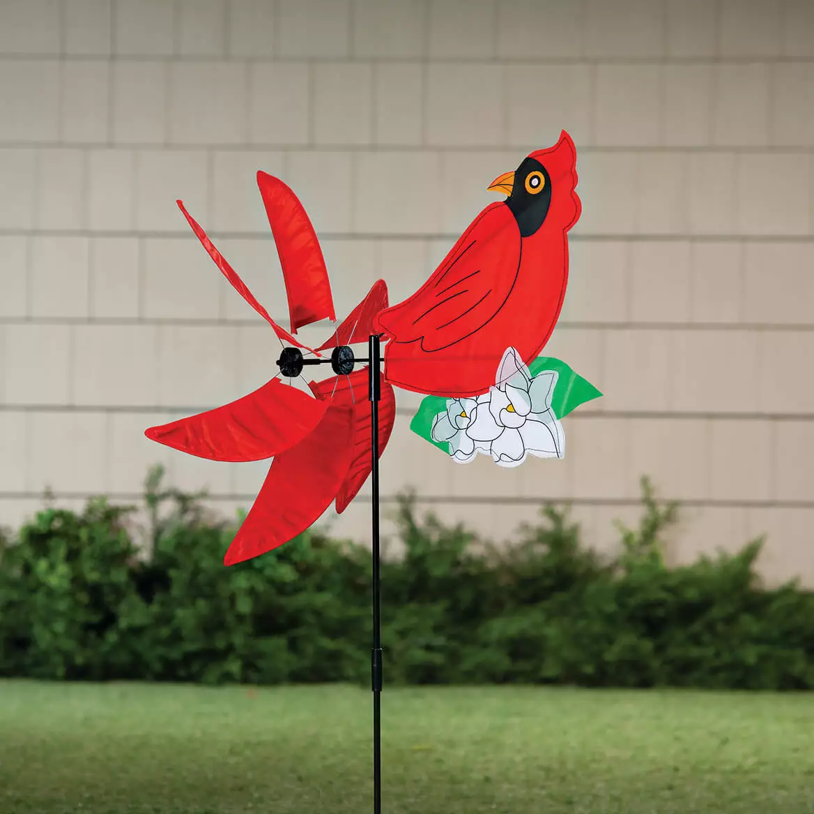 His bright spinning tail whirls round and round in the wind. but this pretty red cardinal spinner won’t fly away. thanks to his sturdy ground stake. Lending a pop of vibrant color wherever displayed. this spinning cardinal yard art offers beauty and movement to enjoy in your garden or yard. at the cottage or campsite … and brings special joy when placed near a gravesite during the holiday season. Simply stake the garden wind spinner in the ground and watch the cardinal’s rotating spinner tail create a whirl of magical motion when the slightest breeze blows. Exclusively designed by Holiday PeakTM. the cardinal garden decor is crafted for outdoor display in weatherproof polyester and plastic. Easy 2-pc. assembly. 17 3/4" long x 35 1/2" wide x 19 3/4" high garden spinner with stake.Enjoy in your yard. at the cottage … and bring special joy when placed near a gravesite|Cardinal’s rotating spinner tail creates a whirl of motion breezes blow|Exclusively designed by Holiday PeakTM|Crafted for outdoor display in weatherproof polyester and plastic|Easy 2-pc. assembly