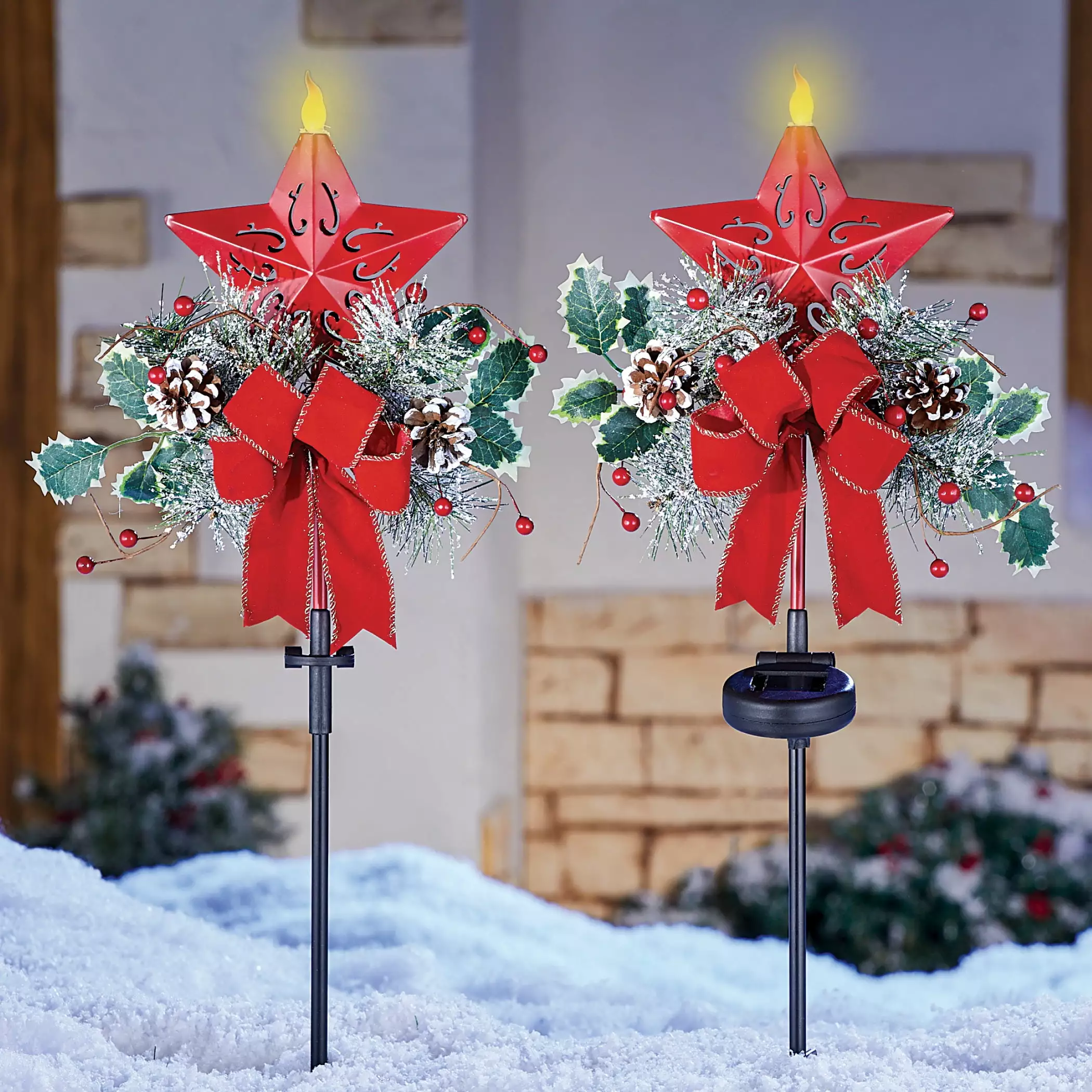 This pair of beautiful star stakes feature an arrangement of holly. pine and pinecones alongside bright red bows. Solar-powered flames automatically shine with light at night making these stakes a festive addition to your outdoor decorating. Includes 1 AA rechargeable battery. Each stakes easily into the ground. Plastic and iron. Each is 12L x 4W x 26 1/2H with stake. Set of 2.