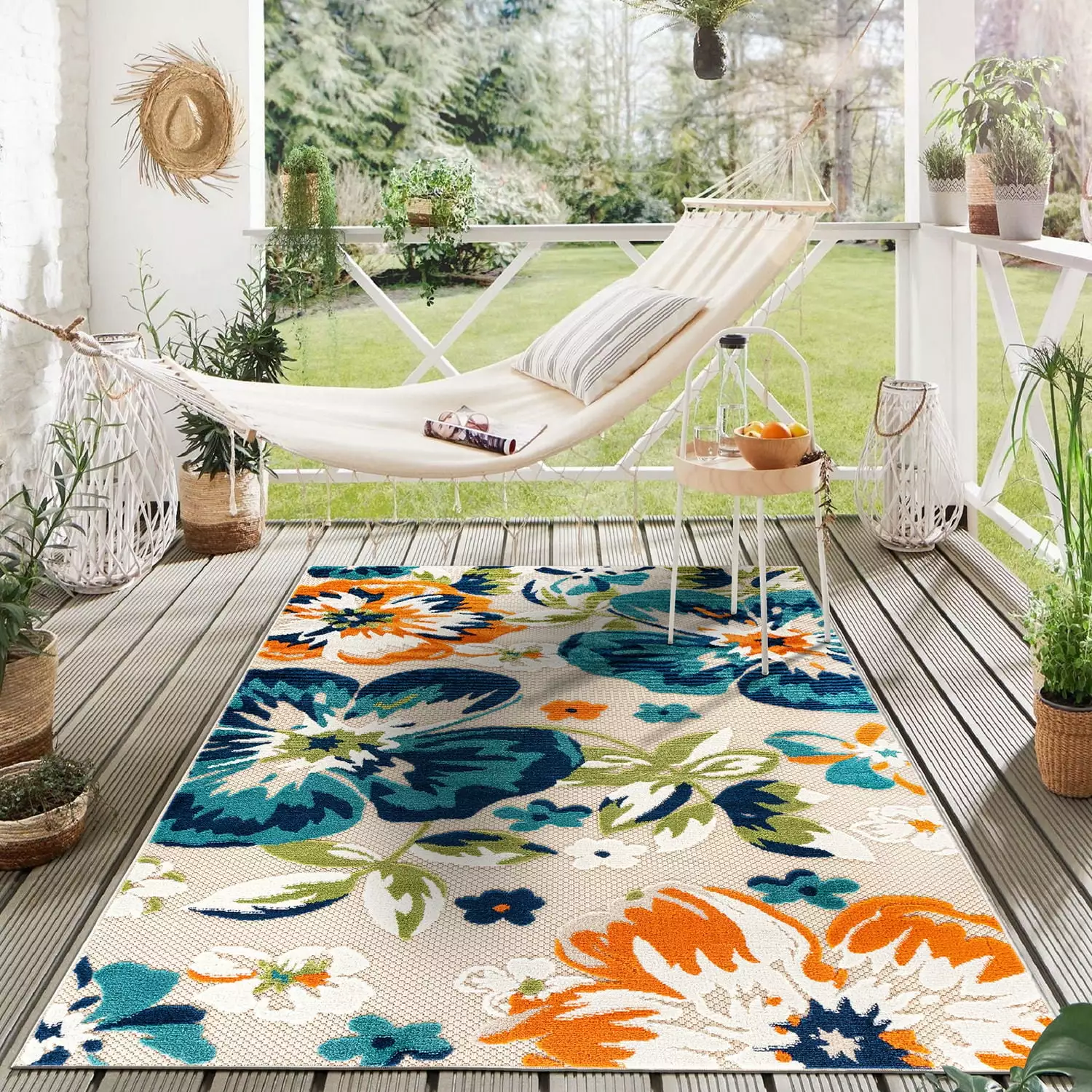 Unroll this mesmerizing rug in or out of your home. The modern contemporary design accompanies sleek floral pattern and vivid colors. The durable pile height allows it to be cleaned quickly and effectively. Made with 100% polypropylene fibers. this rug epitomizes convenience. persistence and allure.For indoor or outdoor use.This collection offers area rugs that are suitable for all indoor/outdoor spaces. Living room rugs. kitchen rugs. bedroom rugs. rugs for the entryway. office rugs. dorm rugs. nursery. kid’s room. playroom. study room. home office. dining room rugs. patio rugs. patio. deck. screened-in porch. outdoor rugs.