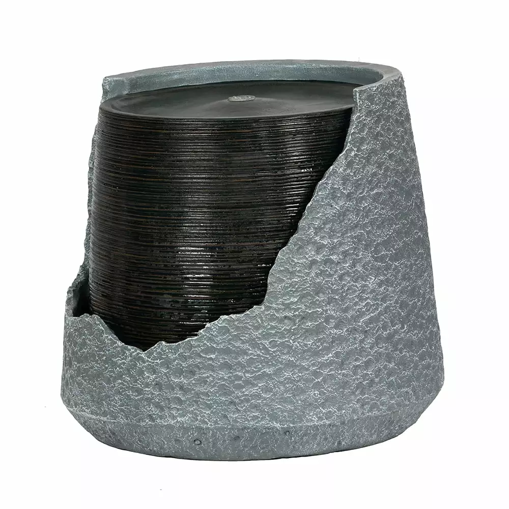 Featuring a dynamic. modern look. this unique 18?? fountain gives the illusion of a broken urn to contain and showcase the beauty of running water. Durably constructed for indoor or outdoor use. this sophisticated fountain adds the soothing sound and sparkle of water to your garden. patio. or sunroom. The chic. sophisticated design and neutral colors complements a variety of styles.