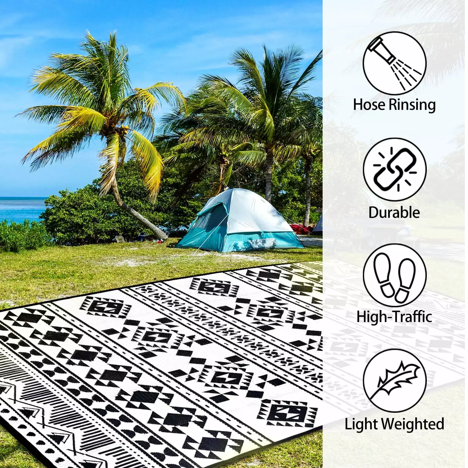 DeeKom Outdoor Rugs for Patio Clearance. Waterproof Plastic Mat. Reversible Carpet. RV. Camper. Bohemia Black & White. 6′ 9′