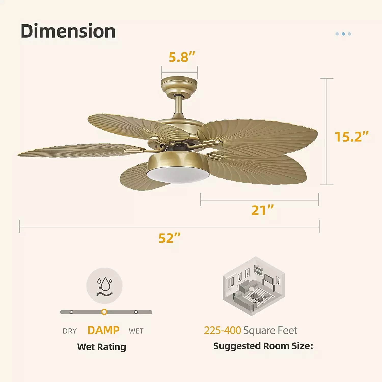 Introducing our Tropical Ceiling Fans with Light and Remote! This 52-inch fan light is not only a stylish addition to your space. but it also comes with a range of amazing features. With a memory function. you can easily set your preferred lighting and fan settings. The lights even have color-changing capabilities. allowing you to create the perfect ambiance for any occasion. The quiet motor ensures a peaceful environment. while the timer function lets you conveniently set the fan to automatically turn off. The palm leaf blades add a touch of elegance and a tropical vibe to your indoor or outdoor space. Made with gold accents. this fan is not only functional but also visually appealing. With its ETL certification. you can trust in its quality and safety. The fan also includes a lightweight bowl-shaped light fixture that adds a subtle glow to your room. Complete with a convenient remote control. installation is a breeze. Upgrade your space with our Tropical Ceiling Fan with Light and Remote today!