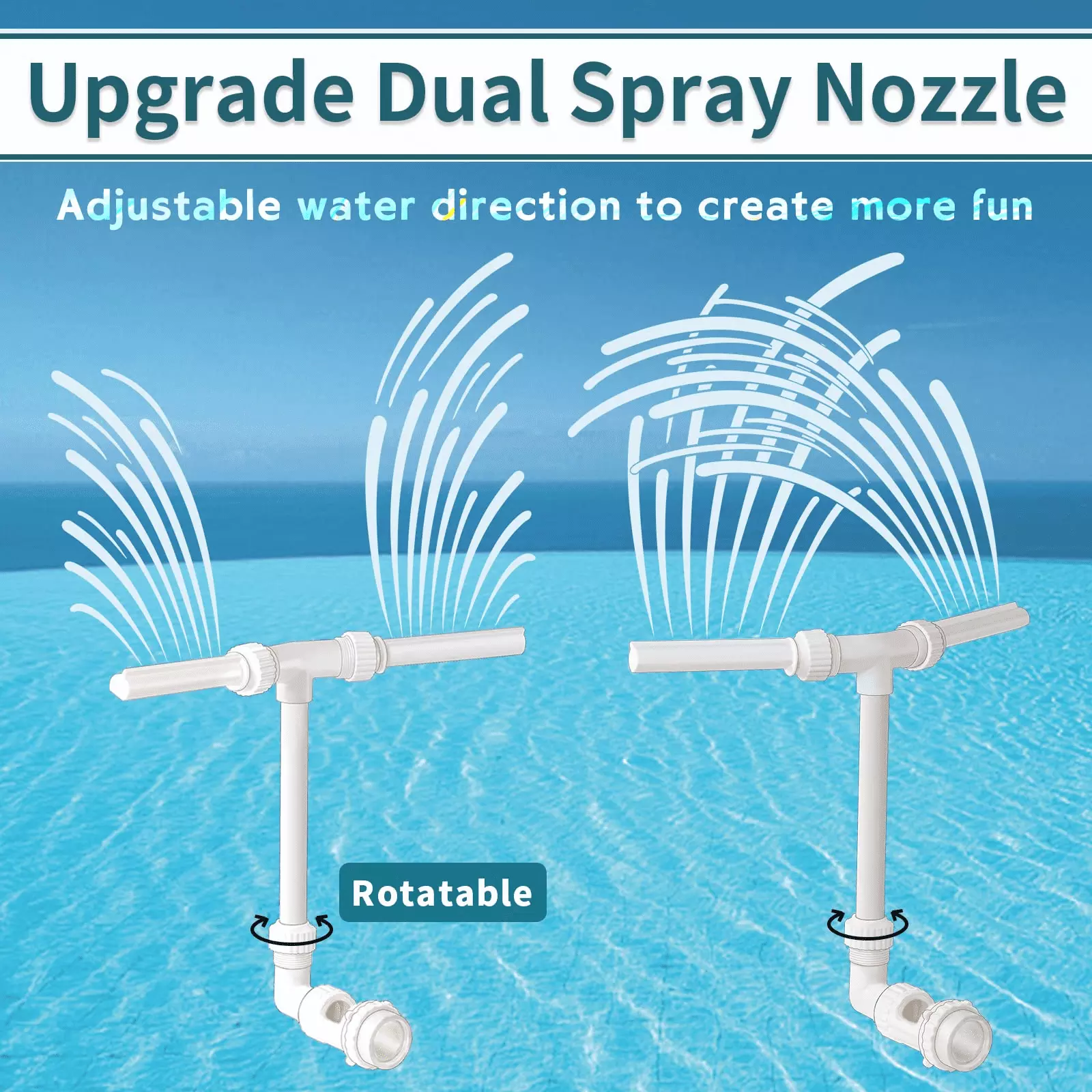 Innovative Dual Sprinkler Fountain: 2 built-in waterfalls spray water from 1 pool outlet. pump twice as much water into the air. quickly cool your pool by creating a wide and tall waterfall. and provide soothing sound to quickly calm down and get rid of the pressure of life. It connects directly to the return outlet of the pump. you will not have to spend additional energy.