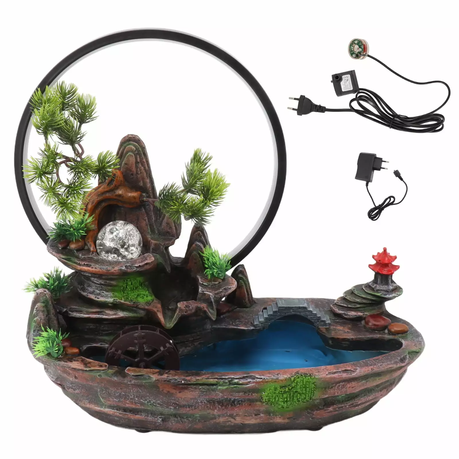 Indoor Tabletop Fountain with Plants Mountain Lamp Loop Resin Desktop Waterfall Ornament for Office Houtilizewarming Gift 100V to 240V EU Plug