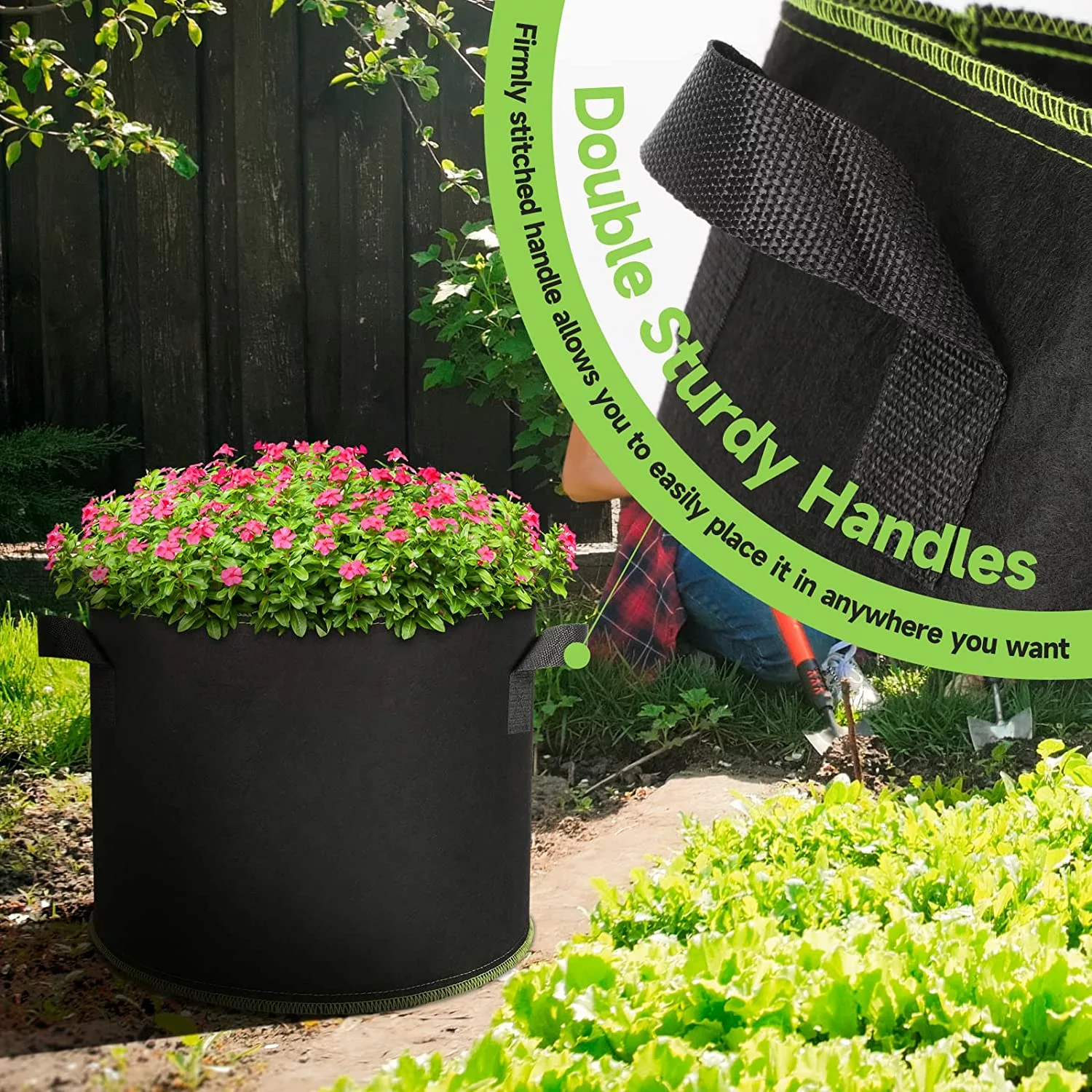 - Each durable grow bags 7 gal has two sturdy handles that are adopted with double thickness and double stitches on the bags. Firmly stitched handle allows you to easily place it in anywhere you want. So if transplantation is required. it avoids the hard work of digging and the risk of root damage.