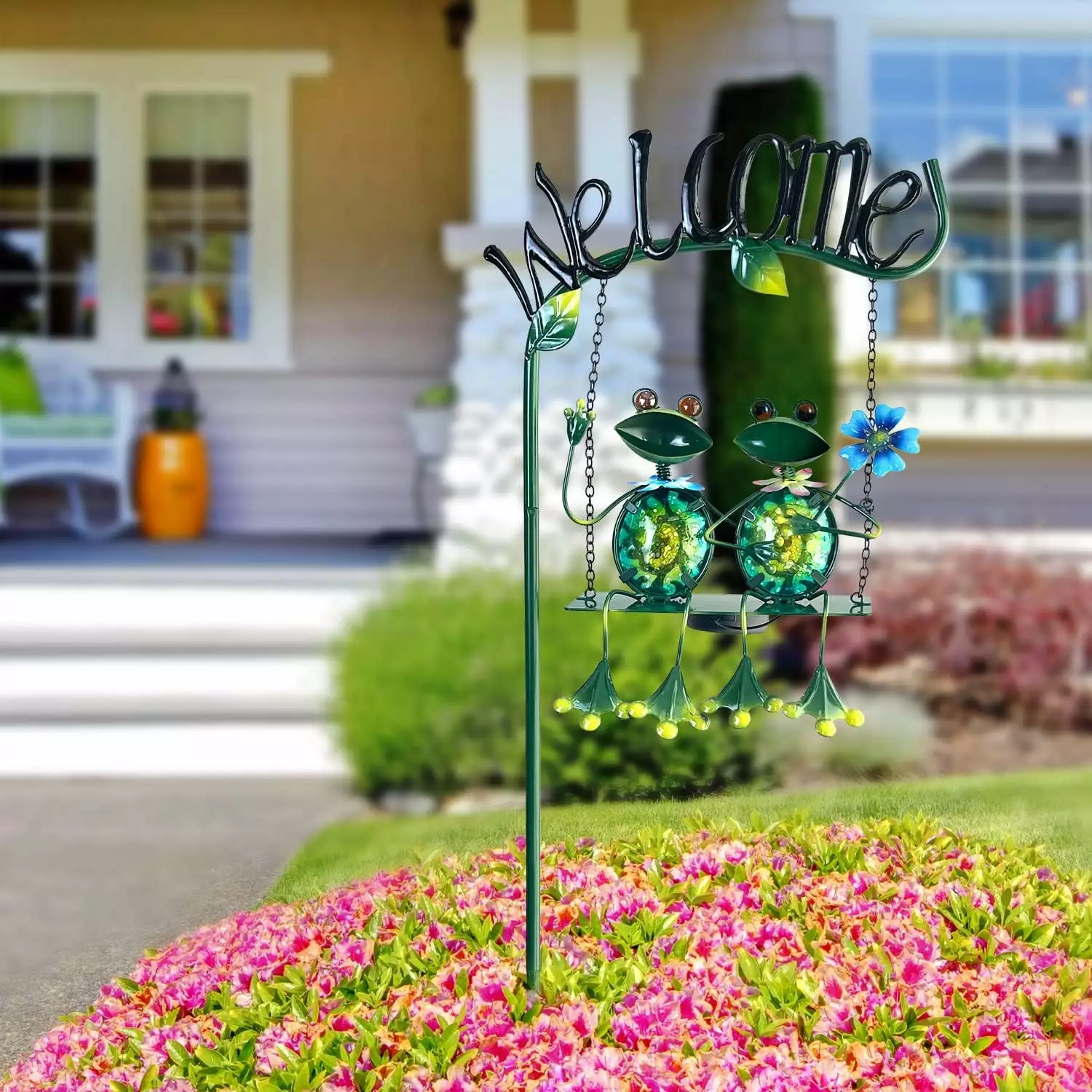 - ??Eye-Catching Outdoor Decor??This frog solar garden stake is a charming addition to your outdoor space. featuring a playful frog swing design and welcoming sign that will enhance any garden. patio. or yard