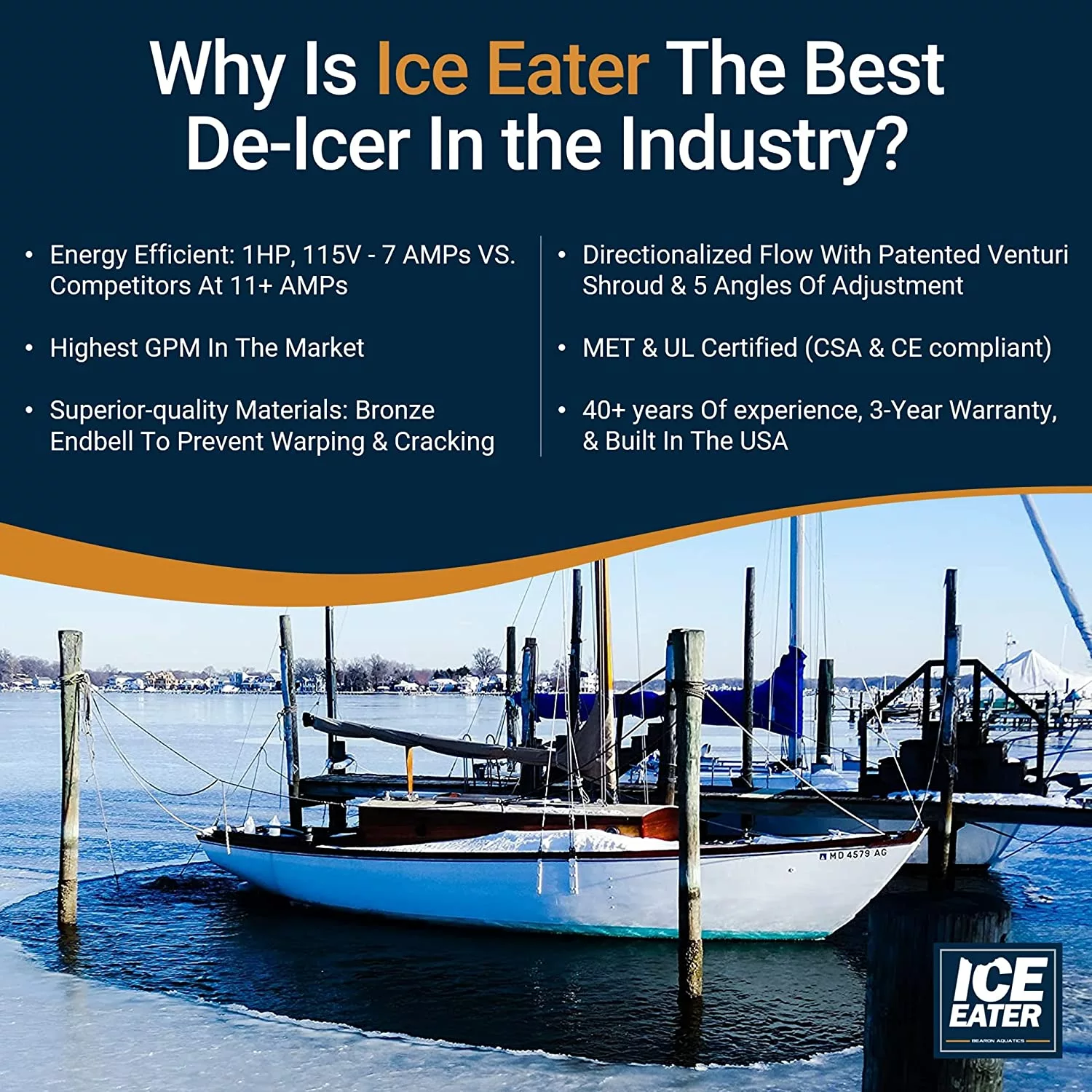 - SUPERIOR PROTECTION: Ice Eater. pond deicer. uses a patented PVC Venturi design for superior water flow. plus the shrouding helps protect propeller & motor. By relying on Ice Eaters. you are ensuring your hard-earned aquatic investments remain accessible and safe before. during. and after heavy winter freezes. Specify the BEST. Specify ICE EATER!