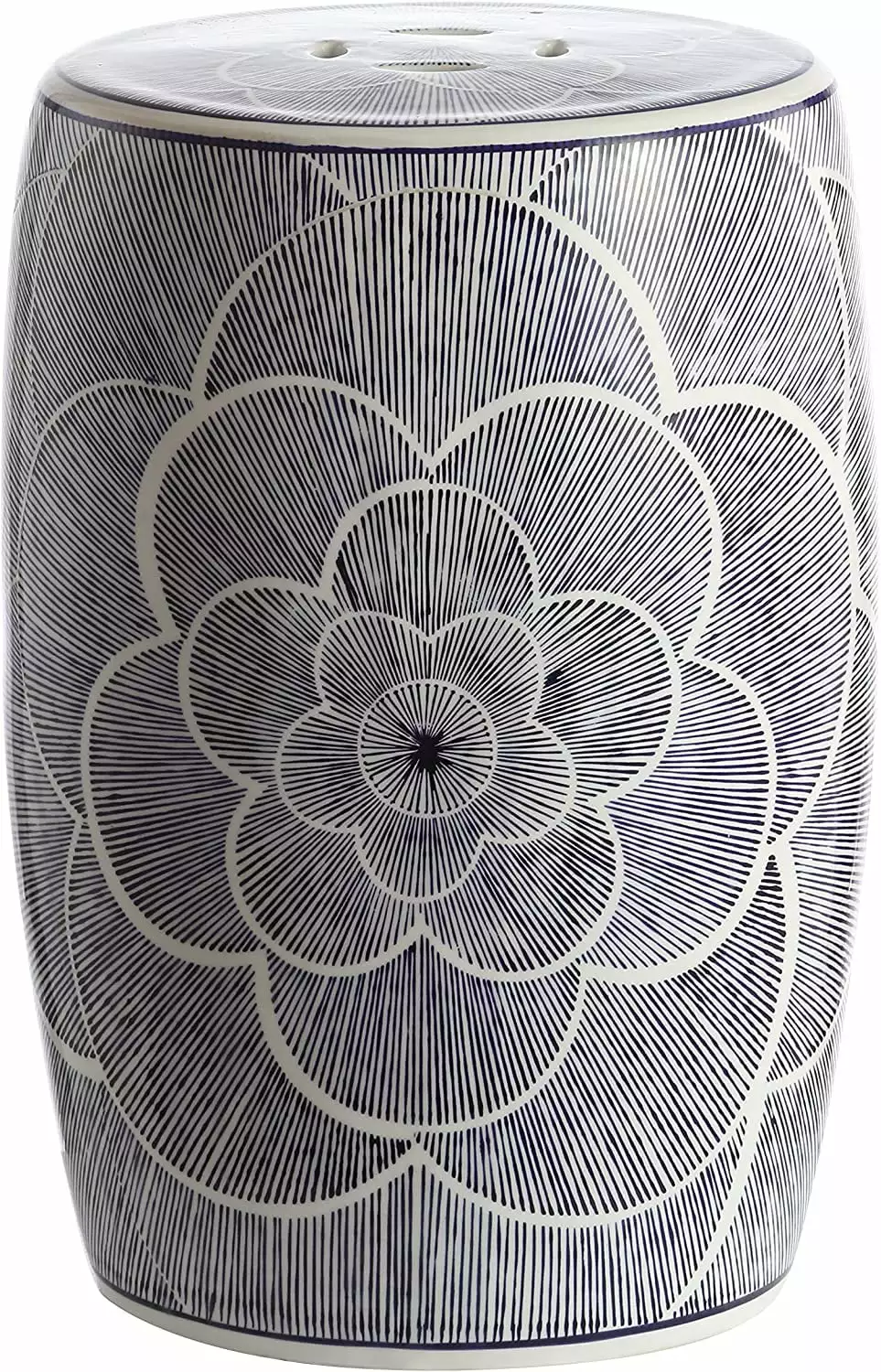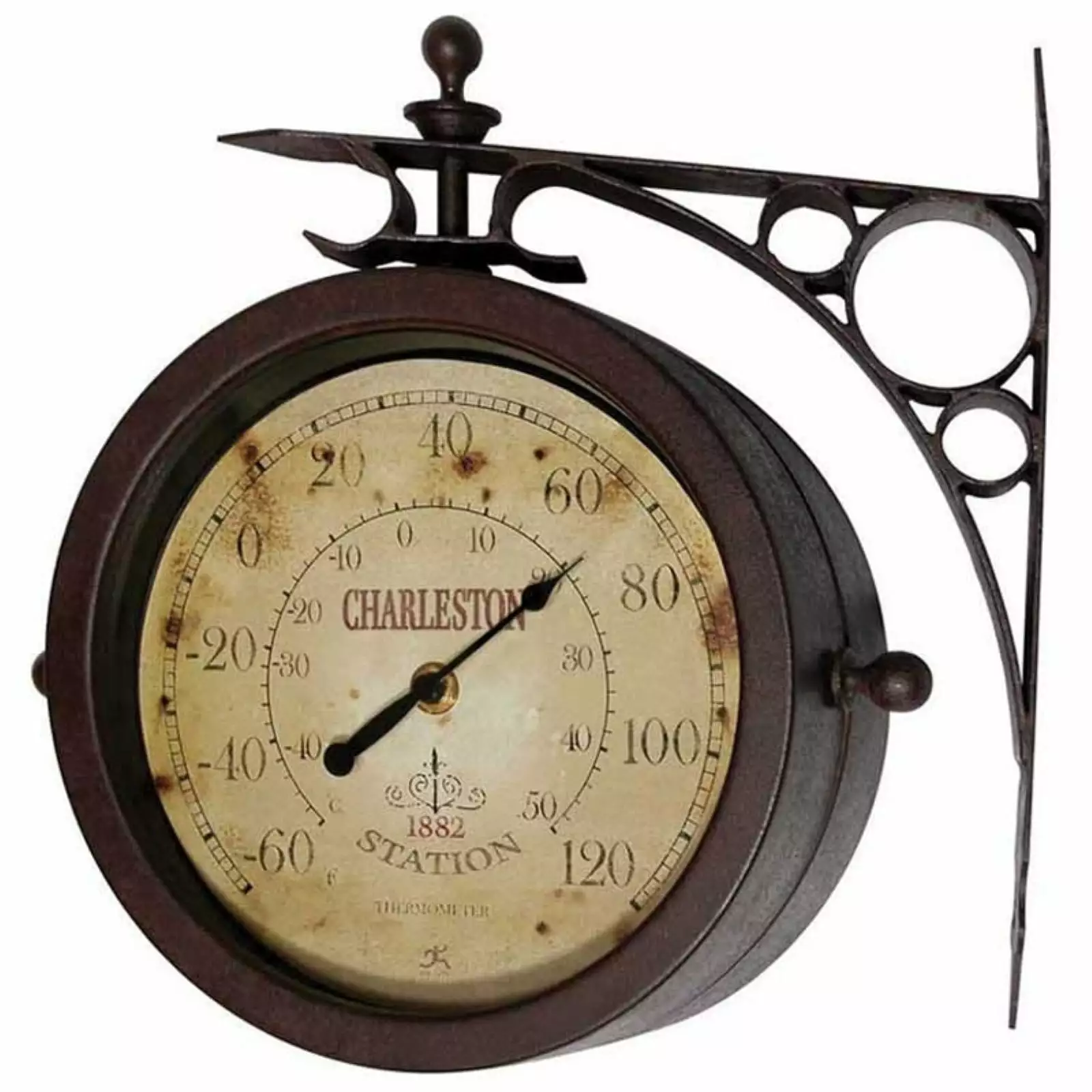 The Two Sided Charleston Thermometer is a playful addition to a backyard. The double-sided design features a clock on one side and a thermometer on the other. This piece is designed to be reminiscent of the hanging clocks often found in older train stations.