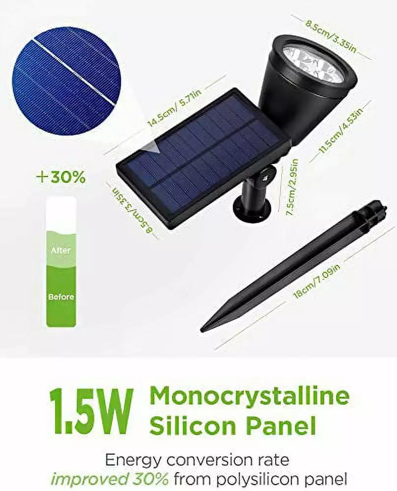 SKU:ADIB07F8NWVKWIndependently Adjustable Light & Panel: Other alter s with combined light panel head could be very difficult to get enough solar absorption while pointing the light up. For InnoGear solar spotlight. you can easily rotate solar panel 180° up and down to capture sun energy effectively while obtaining the best lighting angle; the light head is 90° rotatable to illuminate any place that would be out of reach. | Improved Brightness & 2 Working Modes: With super brightness. this solar spotlight can cast a focused ray to highlight your flagpole or beautiful sculpture. even on the darkest of nights. You have the option to set from High Mode (MAX 6Hrs) to Low Mode (MAX 12Hrs) to extend working time. | Advanced 1.5W Monocrystalline Silicon Solar Panel: The solar energy conversion rate is 30% faster than the old versions by using the latest technology and material. Solar spotlight detects the surrounding light condition and automatically turns on and off. a smooth panel surface keeps dirt and debris from accumulating and blocking sunlight. | 2 Ways of Easy Installation: Package comes in a kit that includes all the tools you need to install the lights by either staking them into the ground or by mounting them onto a wall. Optimum for Patio Porch Path Deck Pool Yard Garden Garage Driveway Pathway. etc. | Outstanding Durability & Quality Guaranteed: It’s resistant to not just rain. but all types of extreme weather. like wind or burning sun. High quality certified by FCC. CE. RoHS. MSDS. UN38.3. etc.