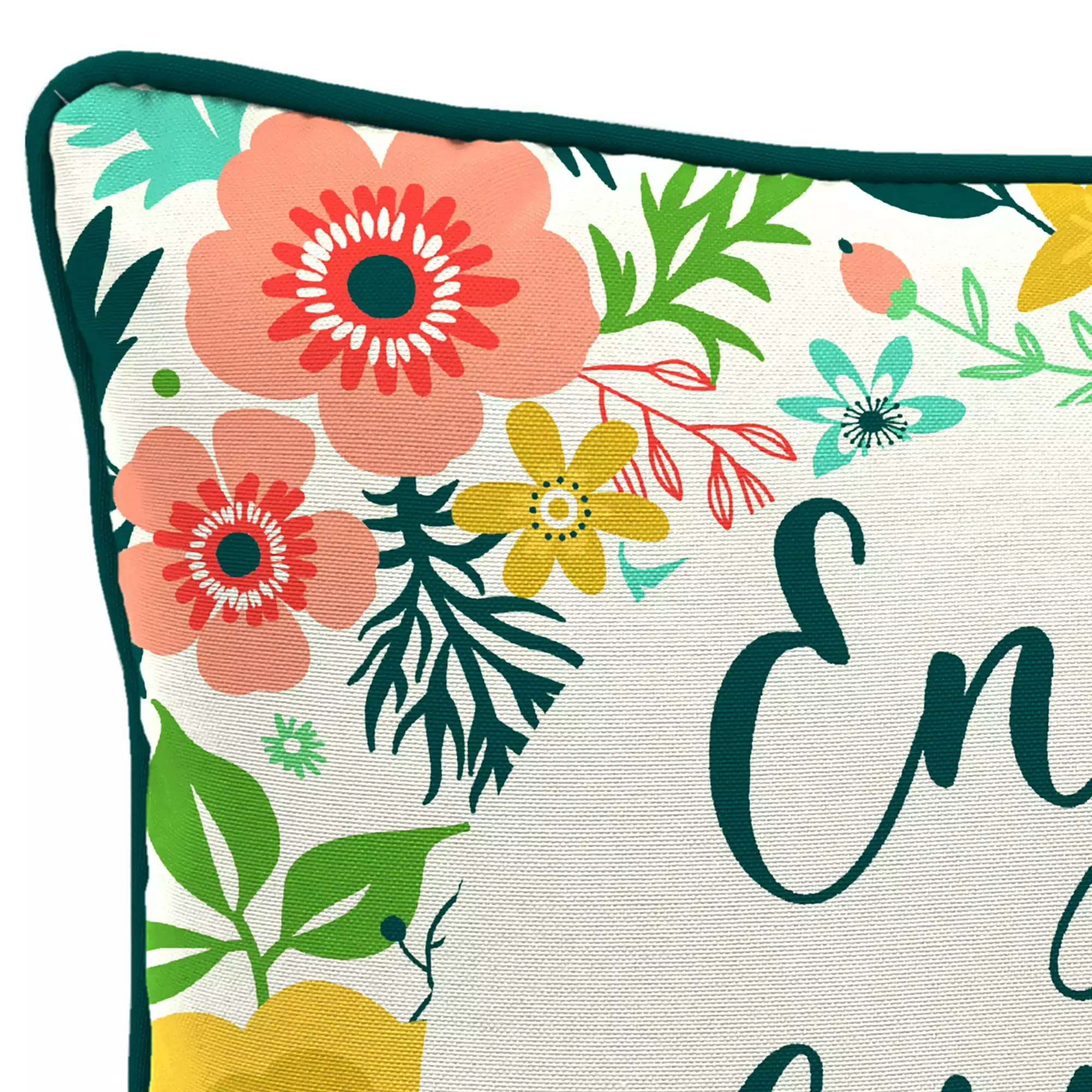 Jordan Manufacturing 16 x 16 Enjoy the Little Things Cream Novelty and Multicolor Floral Reversible Square Outdoor Throw Pillow with Welt
