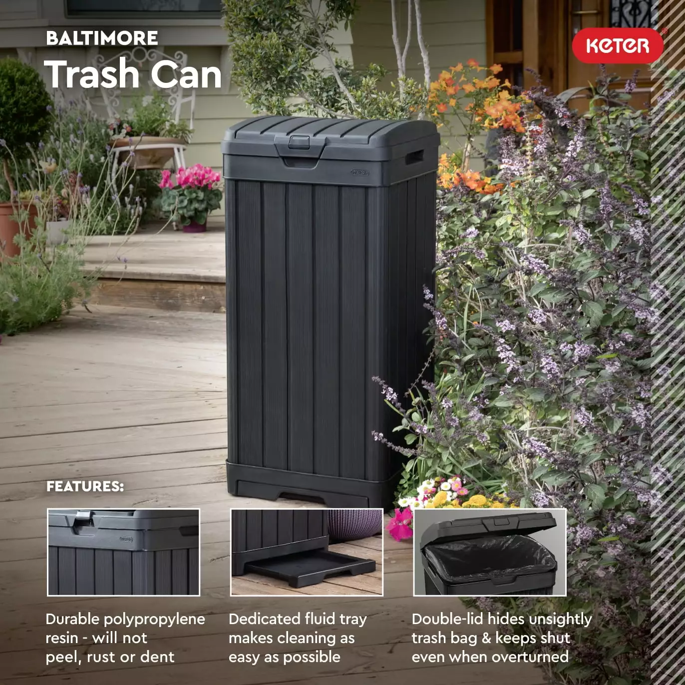 Give your patio or deck the love it needs- keep it looking clean and tidy with the new and attractive Duotech Outdoor Waste Bin by Keter. Other outdoor trash cans look unattractive and bulky. to say the least. and when they accidentally overturn you are left with broken latches and a fresh mess. inviting pests to your next party. This attractive disposal system is customizable to fit in with any outdoor furniture collection and retains its functionality. While the sleek double lid hides the bag inside. it is also keeping the bin shut when completely overturned keeping your trash secure and your investment in waste disposal products protected. It has a dedicated easy-to-remove fluid drawer that makes cleaning the unit as easy as pie. It will never rust or dent and is low maintenance.