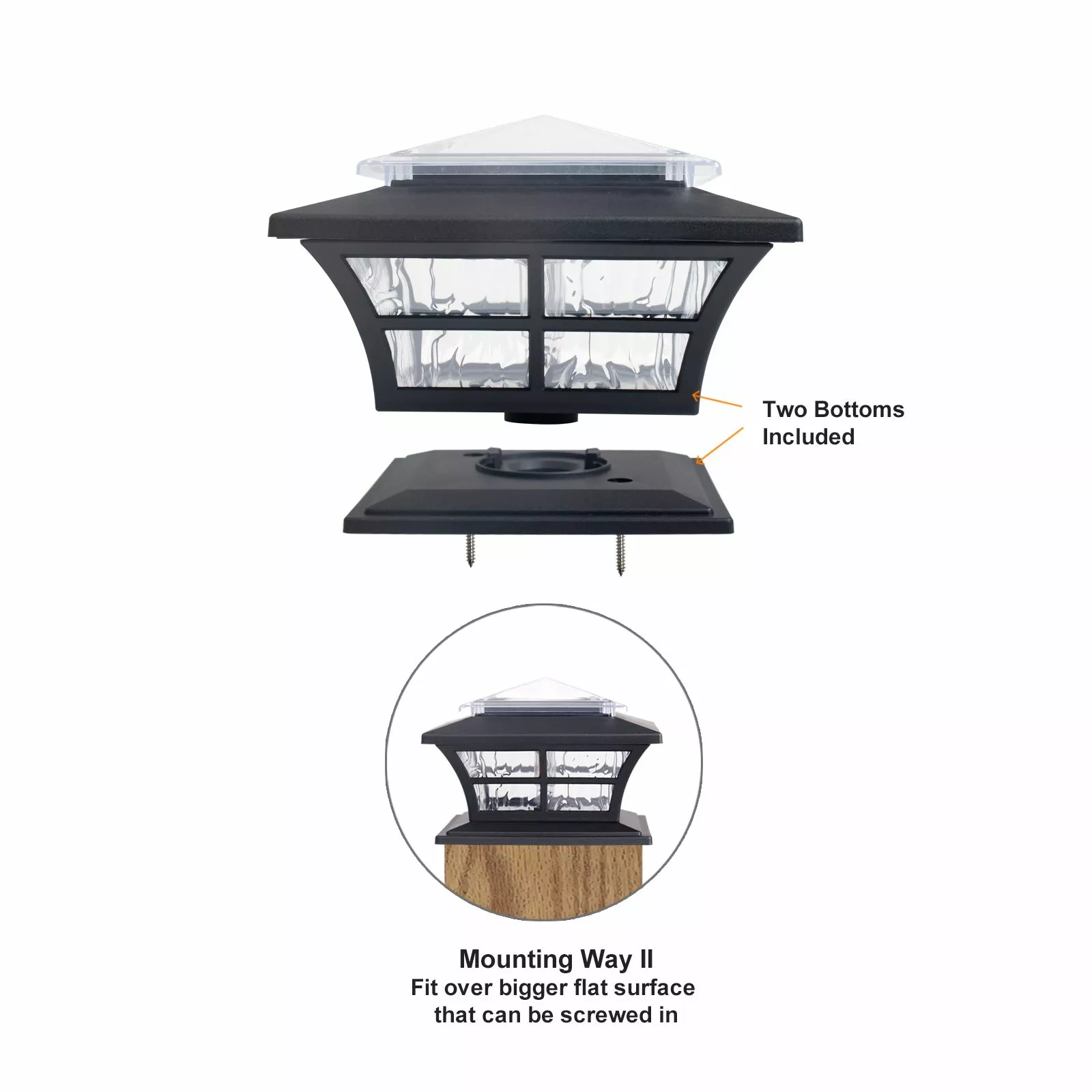 Post Size: The KMC Lighting post solar lights are fit for 4”post square. With the base included. this post solar lights are also fit for bigger flat surface.