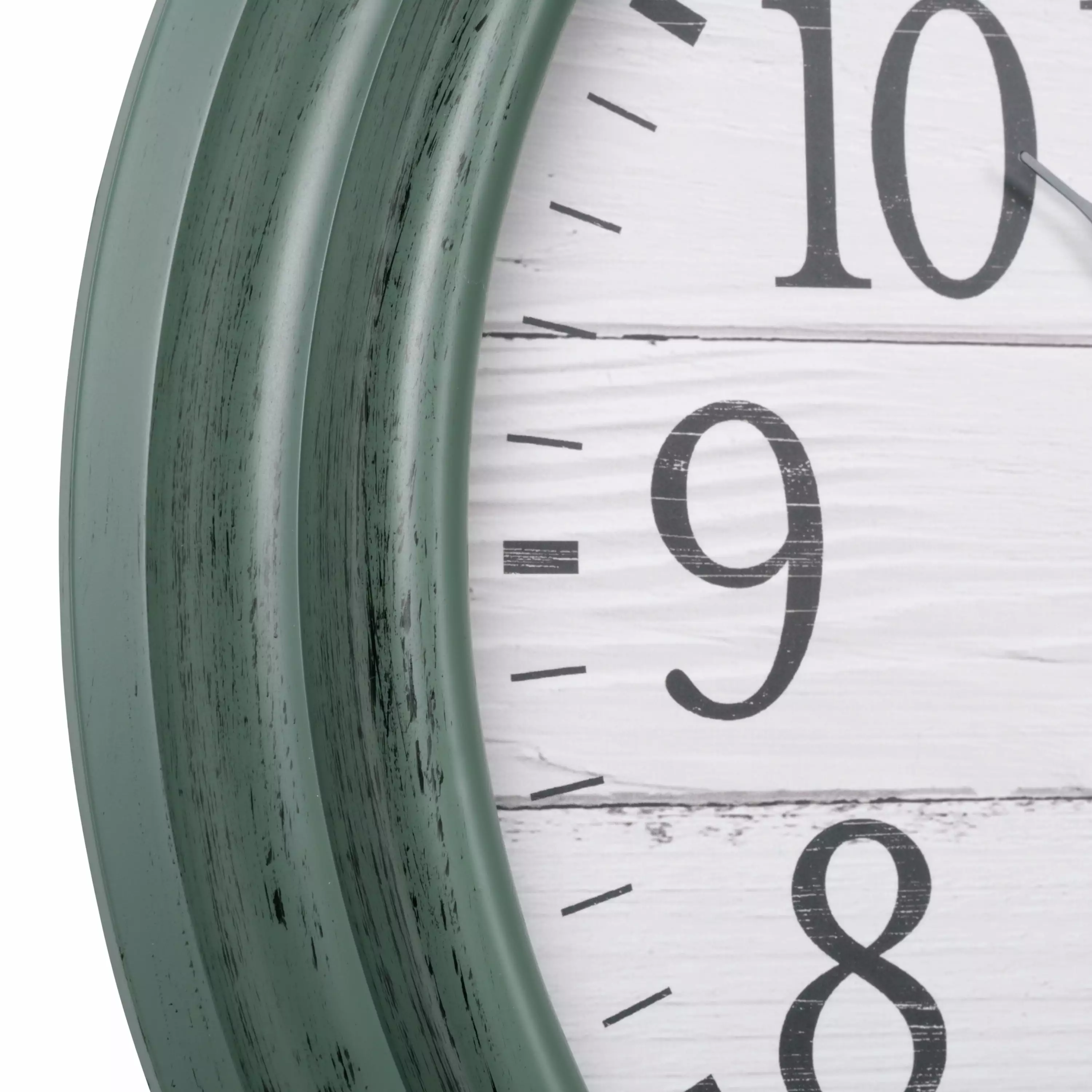 - 15.75 Brushed Moss Green plastic frame with distressed wood designed dial