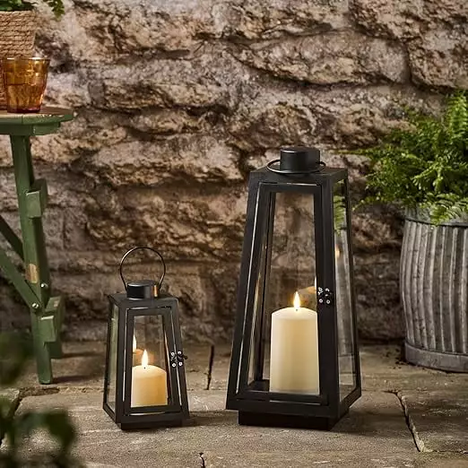 Add a modern accent to your garden with our stylish trapeze black metal candle lantern. In combination with our exclusive TruGlow outdoor candle. the 16 lantern will add a cosy glow wherever it is placed. hung or used as a tabletop decoration.