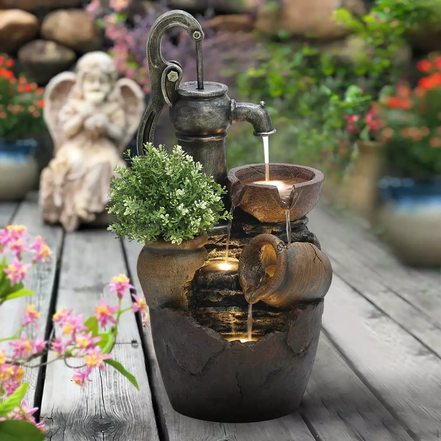 - The fountain features a rustic gray well water pump with a handle and staggered pots